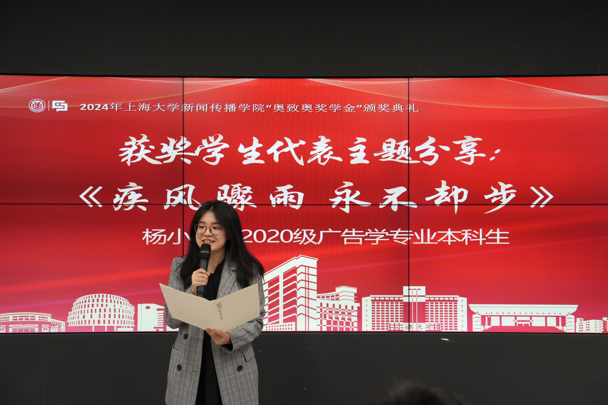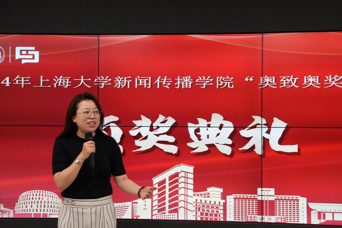 在获奖同学们的表演结束后,党委副书记、副院长王智君作致谢词。她指出追求卓越的过程永无止境,新传学子需要不断挑战自我。同时,今年是奥致奥奖学金设立的第一年,王智君老师希望同学们作为第一届获奖者,能够不负公司和学院的期望,在专业道路上继续深耕,再创佳绩。