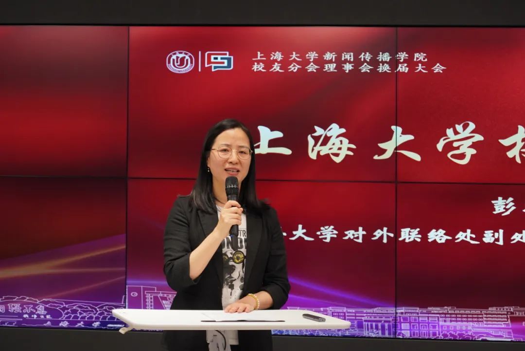 ac米兰官网中文网站对外联络处副处长、校友会办公室副主任彭明霞代表学校对各位新传校友表示欢迎,也对各位校友一贯支持学校育人工作表示感谢,同时也对新闻传播学院校友分会理事会换届大会的召开表示祝贺。她表示,学校校友办积极支持新闻传播学院校友工作,对校友分会理事会换届筹备工作给予相关指导。在校友分会新一届理事会成立之际,希望各位校友用心传承上大精神,齐心建设一流大学,在各项工作中取得更大成就。