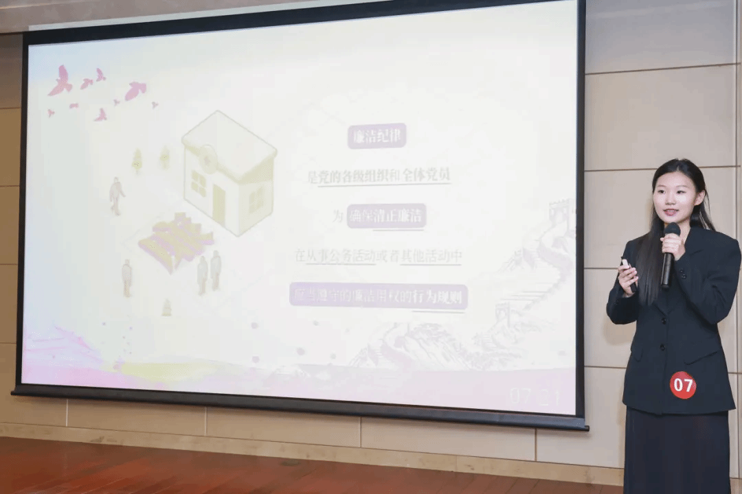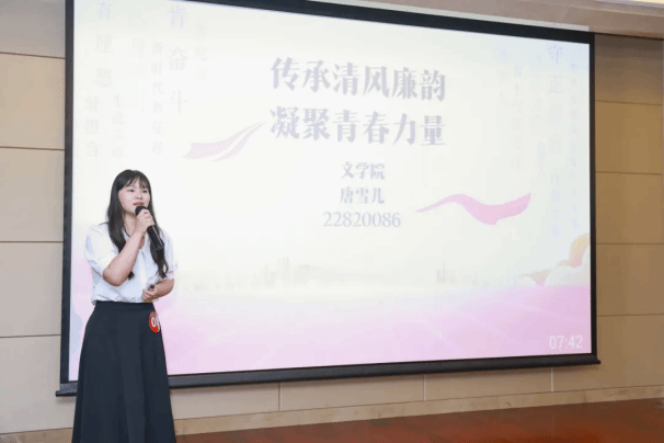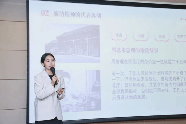 理学院研究生党员何橹灵、悉尼工商学院研究生党员余沁原、力学与工程科学学院研究生党员袁佳雨、微电子学院研究生党员俞浩、机电工程与自动化学院研究生党员岂溶欣、环境与化学工程学院研究生党员蒋文灏、马克思主义学院党员邓昊琳,通过讲述周恩来、刘启耀、廖俊波等近现代人物的廉洁故事,激励广大青年研究生党员从故事中汲取精神力量,常紧纪律之弦、常存敬畏之心。