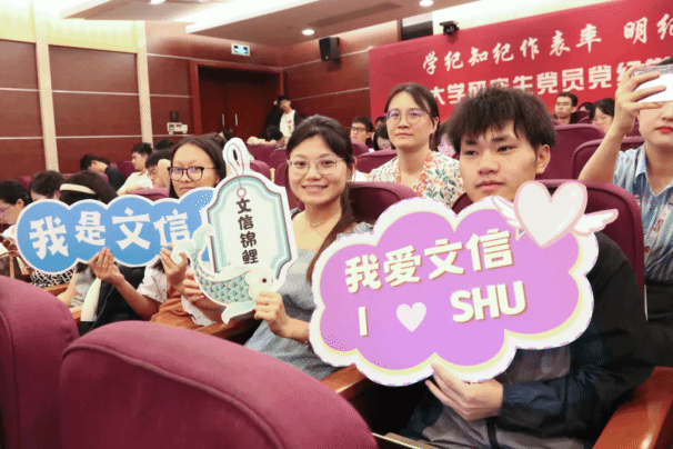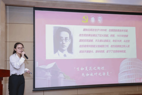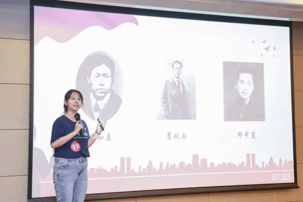 新闻传播学院研究生党员苗雨玮、文化遗产与信息管理学院研究生党员闫欢欢讲述瞿秋白、蔡和森、邓中夏等老上大人物的廉洁故事,深情缅怀革命先辈的丰功伟绩,重温党的纪律建设的历史。蔡和森首次提出“党的纪律为铁的纪律”这一宣言今天听来仍然铿锵有力,震撼人心。
