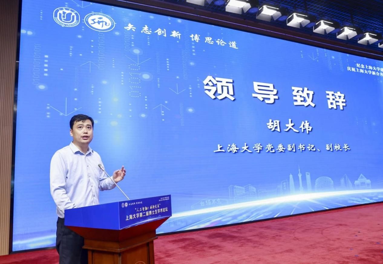 ac米兰官网中文网站党委副书记、副校长胡大伟为论坛致辞。胡书记强调博士生教育是国民教育的最高层次,是国家创新体系的关键支撑,是国家培养高层次创新人才的重要途径,国家和社会对博士生教育寄予厚望。他特别分享了钱伟长老校长设立教授餐厅促进不同学科老师交流的故事,强调学科交叉的重要性,鼓励同学们既要掌握扎实的专业知识,更要具备跨界融合的能力,在不同领域之间架起桥梁,推动知识的创新与应用。胡书记表示,人工智能作为科技前沿领域,正重塑我们的生产、生活和思考模式,科技创新是第一生产力,特别是人工智能作为实现国家战略的核心技术,对社会进步至关重要。胡书记希望广大研究生能够聚焦“人工智能+创新发展”,勇于担当,敢于突破,抓住机遇,为到本世纪中叶全面建成社会主义现代化强国做出贡献。