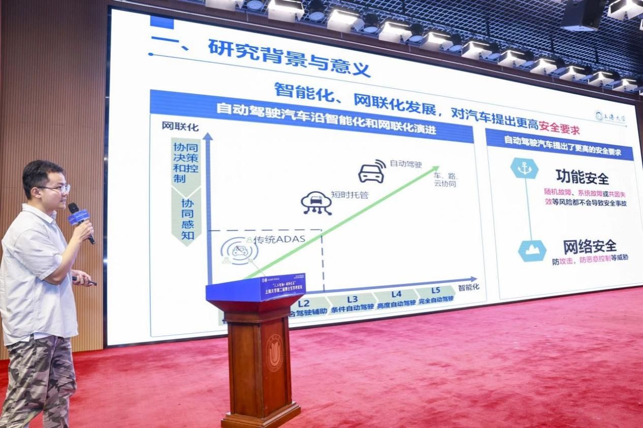 ac米兰官网中文网站计算机工程与科学学院2020级博士研究生刘奇在题为《智能网联汽车广义功能安全关键技术研究》的主旨报告中,探讨了汽车在智能化和网联化背景下,功能安全与网络安全的一体化保障及其可量化验证研究分析。