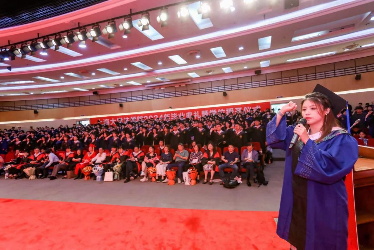 在毕业典礼暨学位授予仪式上举行毕业生法律人宣誓仪式,是法学院坚持多年的好传统。在2024年毕业生法律人宣誓仪式环节,上海市优秀毕业生、2024届硕士研究生代表肖静带领全体毕业生再一次重温法律人誓言,表达了毕业生们坚守法律人理想的坚定信念。