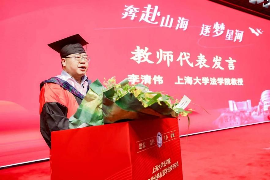 莘莘学子意、浓浓师生情。ac米兰官网中文网站法学院教授李清伟老师作为教师代表发言。李教授殷切祝愿同学们未来怀揣法治之梦,扬法律理性之帆,启法律职业成功之路,并给予了毕业生们三点寄语。首先,以法律为业,要保持理性、恪守正义。法律的运行并不是简单的技术主义作业,许多案件的裁判需要以正义为尺度,兼用理性与智慧作出。其次,以法律为业,要坚守法律的德性底线、尊重法治规律。不论从事何种职业,都要坚守法律的底线、恪守法治原则,不屈从于任何权威,秉持法律的德性,法治的愿景终将“行则将至”。最后,以法律为业,要心存感激,行稳致远。法律向来不是冷冰冰的“械具”,法律是为人服务的,要懂得体悟法律之爱。李清伟教授嘱托同学们要懂得感恩,即使离别也不忘常回家看看,并衷心祝愿所有毕业生鹏程万里,前程似锦。