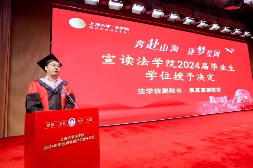 法学院副院长袁真富副教授宣读法学院2024年毕业生学位授予决定,法学院副院长袁曾副教授、法学院副院长袁真富副教授分别为本、硕毕业生唱名。