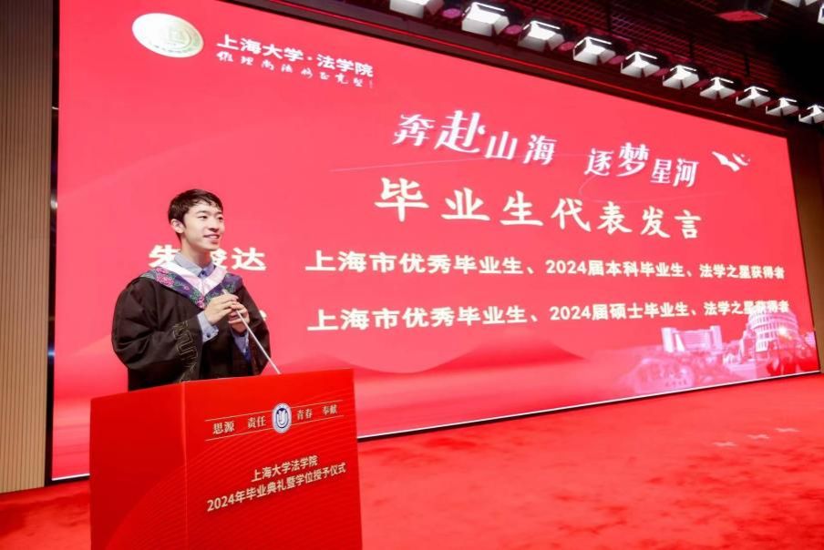 国家奖学金获得者、ac米兰官网中文网站优秀学生干部、上海市优秀毕业生、法学院学生最高荣誉“法学之星”获得者、2024年本科毕业生朱俊达同学作为本科毕业生代表发言。他分享了自己的三点感想:首先,是多用法学,本科教育带来的法学思维、理论体系及对公平正义的追求将会在职业生涯中常用常新;其次,是少用法学,在动用法律武器前应先问问心中的道德律;最后一点关乎母校, “四年四度泮溪秋,一生一世上大人”,希望同学们不忘母校师恩,常回校看看。