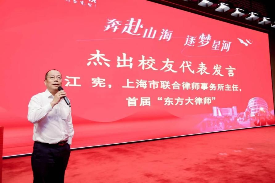 法脉相连,学长情深。首届“东方大律师”、上海市联合律师事务所主任江宪律师作为杰出校友代表发言。江宪校友表示,毕业生们即将奔赴山海,在法学院学习到的知识还不足够,仍应到实践中继续学习,去体悟世界的多元、多彩。江宪校友结合自己从事法律工作多年的感悟与经历,以自己曾经参与过的真实案件为例,告诉毕业生们司法实践并非总是非黑即白泾渭分明,从理论走向实务后,同学们会面临各种答案,要摒弃非黑即白的思路,秉持正义公平之心,寻找最好的答案。此外,学弟学妹们也要逐梦星河,追寻诗和远方,要提升格局,跳出法律看法律,成为一个真正眼光深邃、目光长远的杰出法律人。