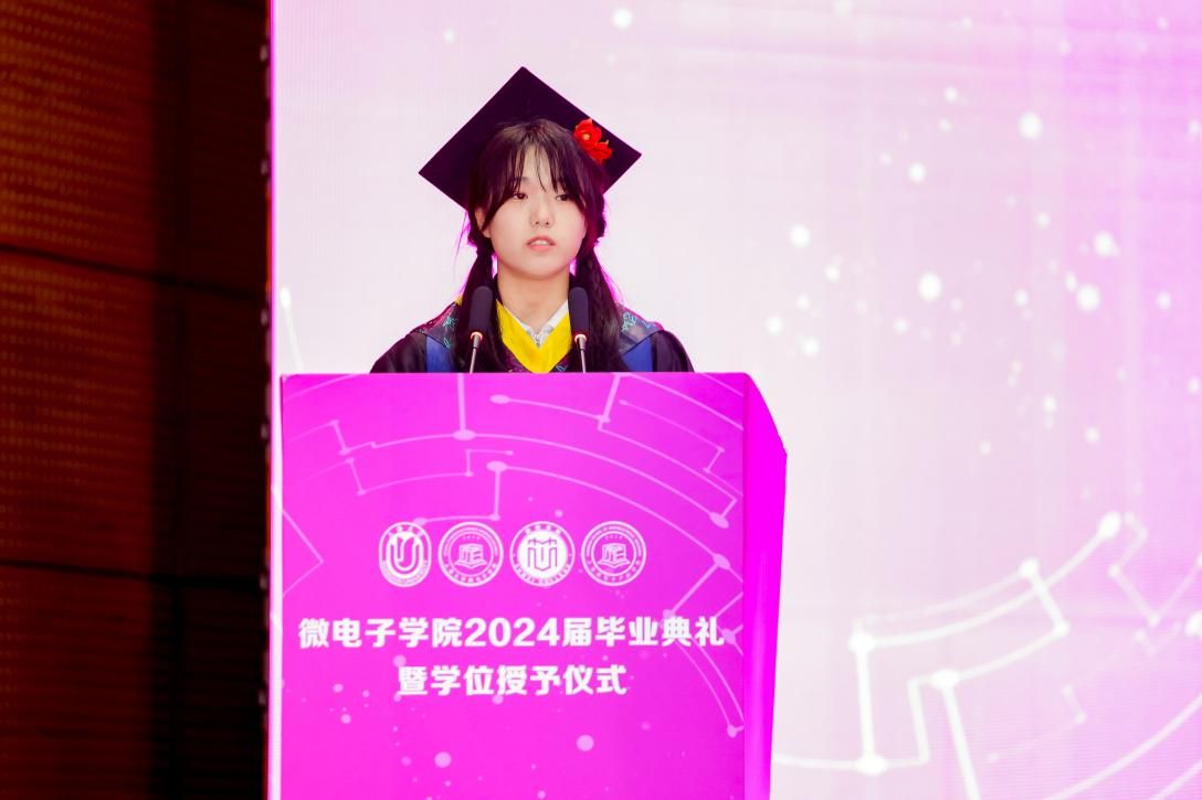 伴随着国歌的嘹亮奏响,全场洋溢着青春的激情。这是一场期待已久的典礼,同时也象征着2024届学子们即将告别校园,迈向人生新篇章的重要时刻。微电子学院2024届毕业生中,本科生超过60%的同学将赴境内外知名高校深造,直接就业的研究生中有超过90%的同学即将奔赴集成电路相关企业及其相关岗位建功立业。