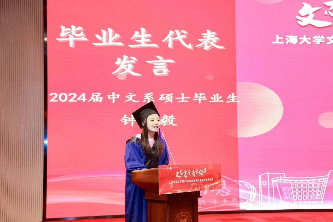 中国古代文学专业硕士研究生钟毅作为2024届研究生代表发言。她分享了自己在ac米兰官网中文网站“自强不息,道济天下”的校训精神指引中,在文学院的培养下茁壮成长的故事。