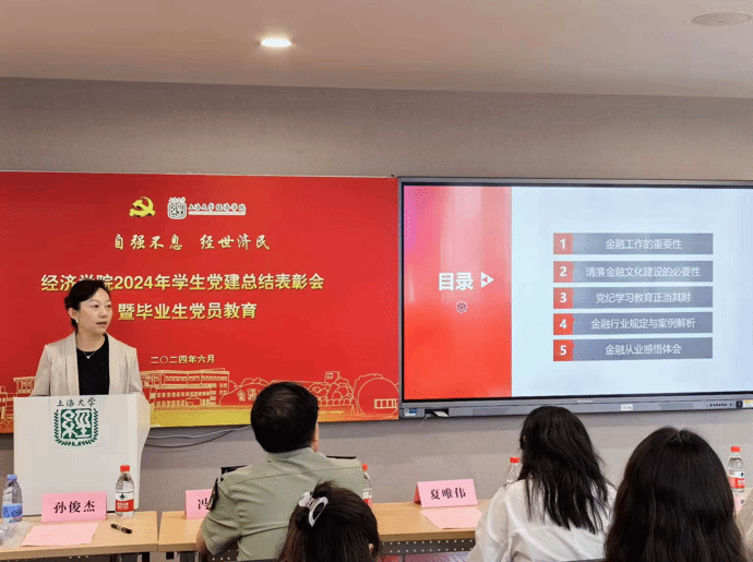 中国工商银行上海市分行营业部纪委书记、党委委员孙俊杰为各位毕业党员开展主题为清廉金融的毕业生党员教育。孙书记从金融工作重要性、清廉金融文化建设的必要性、党纪学习教育正当其时、金融行业规定与案例解析和金融从业感悟体会五个方面进行分享,并结合相关行业规定、案例解析与自身经历向毕业生阐述工作中廉洁、道德、诚信、稳健的重要性,嘱咐毕业生秉持政治力、专业力、责任力、协同力、自驱力、自律力,扣好廉洁从业第一粒纽扣,扣好廉洁从业每一粒纽扣。并从职业规范、职业发展等方面为毕业生给出建议,鼓励毕业生不断学习与积累,充实自我,以面对未来的人生挑战。