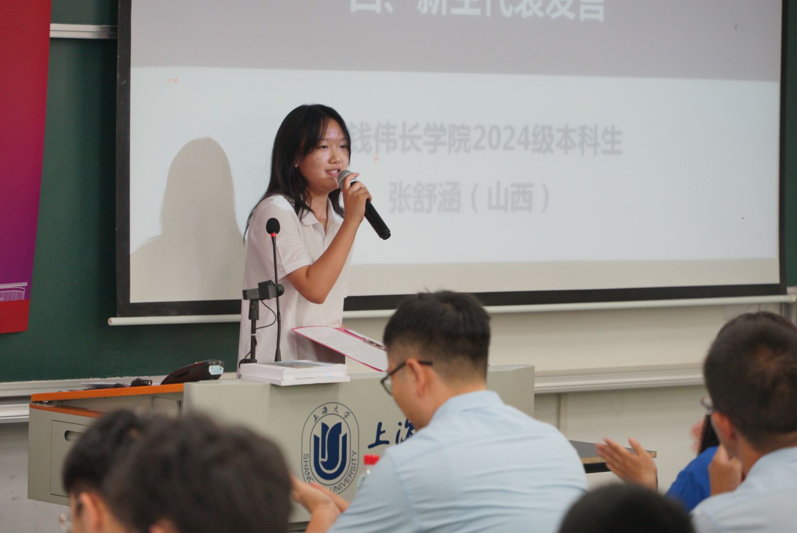 随后,2024级新生张舒涵作为新生代表发言,她分享了自己来到ac米兰官网中文网站后的所见、所感、所想,表达了自己坚定选择基础学科的信心,期待能在自己喜欢的领域学有所获。她表示要践行“自强不息、道济天下”的校训,秉持“上善若水、海纳百川、大道明德、学用济世”的大学精神,保持初心,在追梦路上不断前行。