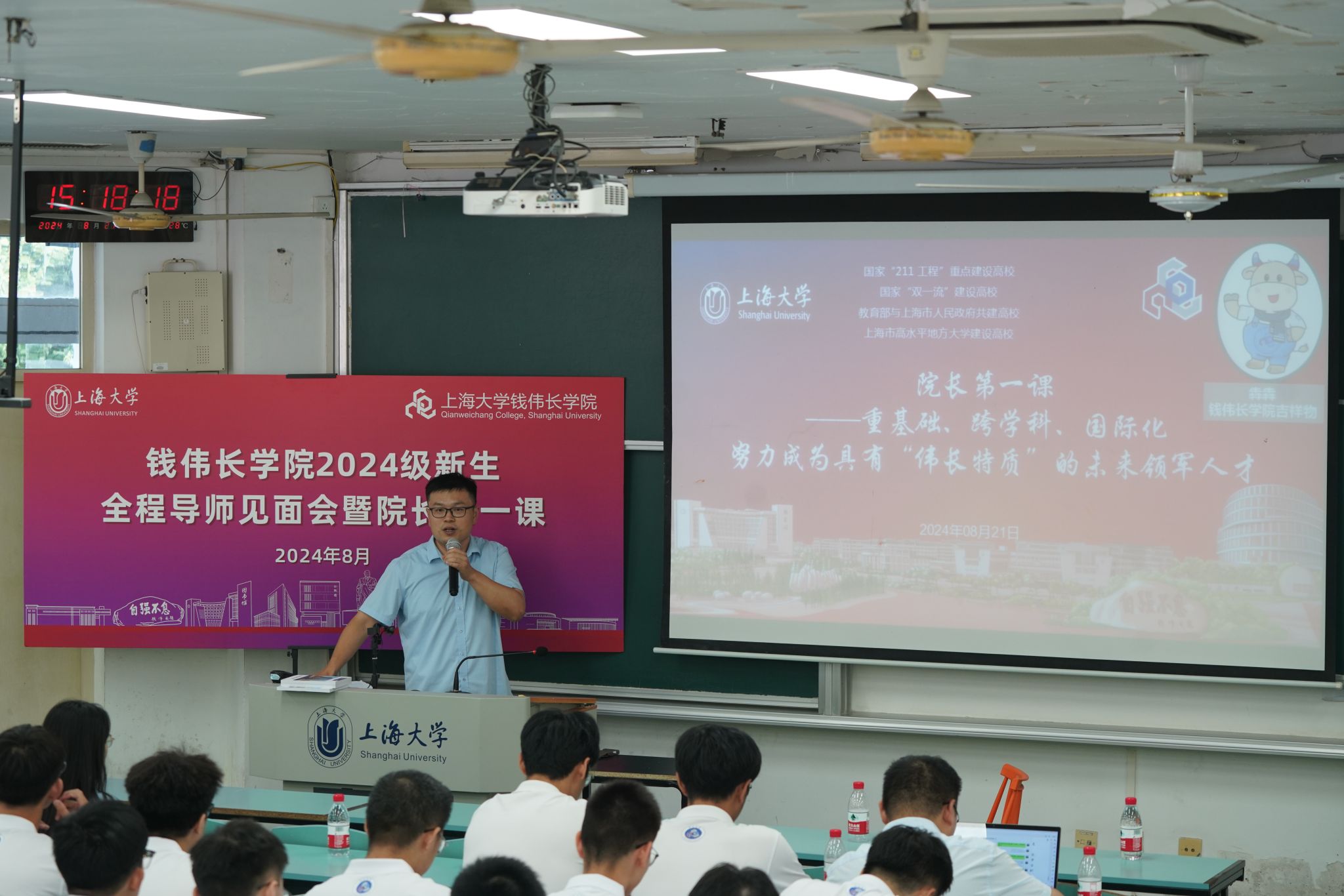 会议的第二部分是钱伟长学院党委副书记、院长、伟长书院院长周全教授为同学们带来院长第一课。周全院长热情洋溢地欢迎2024级新生加入钱伟长学院,并简要介绍了钱伟长学院的办学历史、办学理念、导师制度、培养方案、育人成效等。他对新生提出三点期望:一是希望同学们自我约束、自我管理,尽快适应全新的大学生活;二是规划好自己四年的学习生活,自主学习,勇于探索;三是积极主动参加学院的各项活动,注重综合素质的提升和科创能力的培养。最后周院长祝愿同学们在未来四年里学有所成,成为具有“伟长特质”的青年。