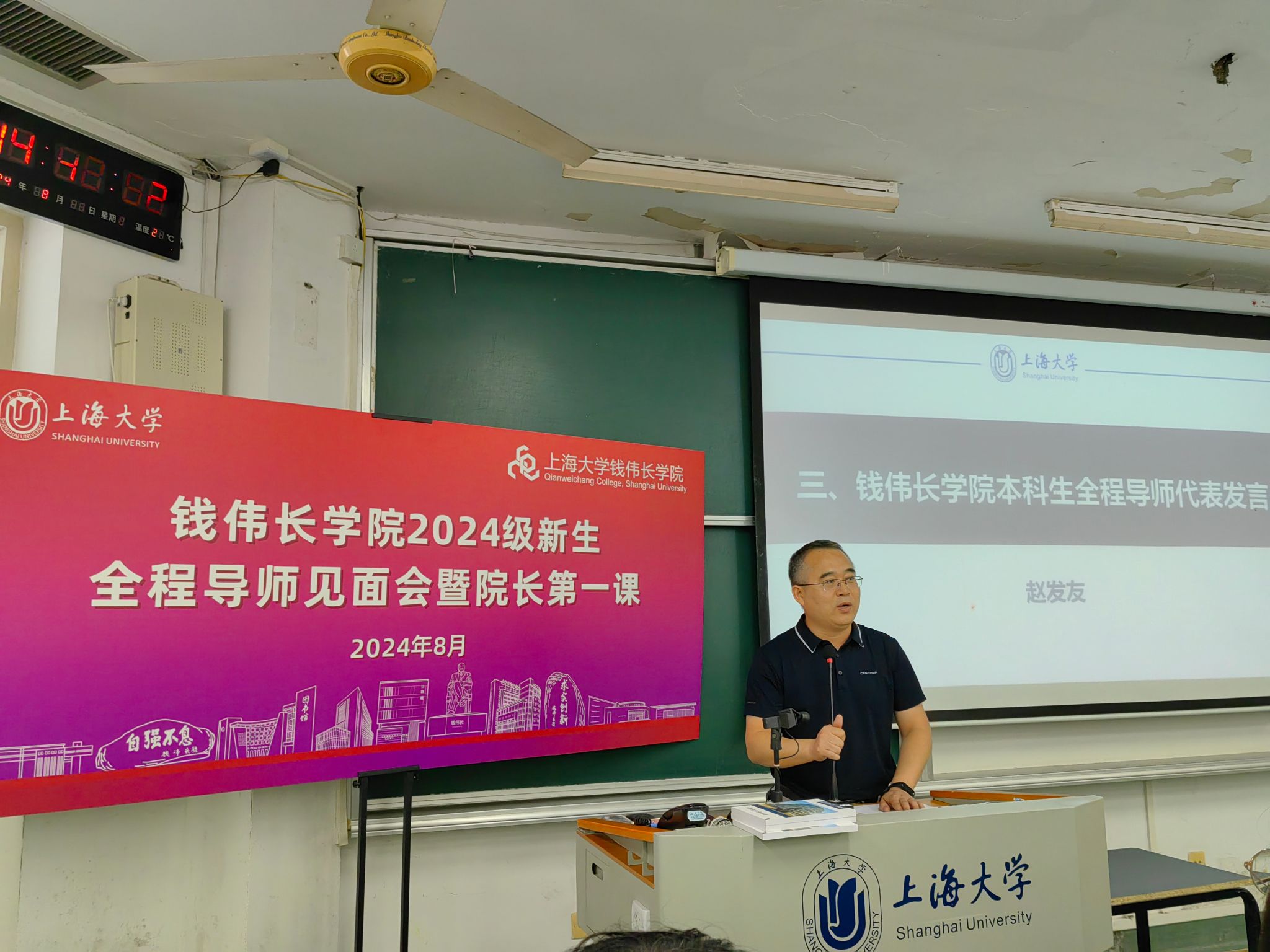紧接着,赵发友老师作为钱伟长学院全程导师代表发言,赵老师首先欢迎2024级新生加入钱伟长学院,然后介绍了全程导师的职责所在,并以2020级优秀学长为例,勉励同学们好好学习,以更高标准要求自己,期望同学们在大学期间取得优异成绩并全面发展。之后,邢菲菲、杨炯、李倩倩、席丽丽和熊杰老师也从自身经历出发分别从化学、材料设计等专业角度向新生们提出了建议,并表达了欢迎与祝福。