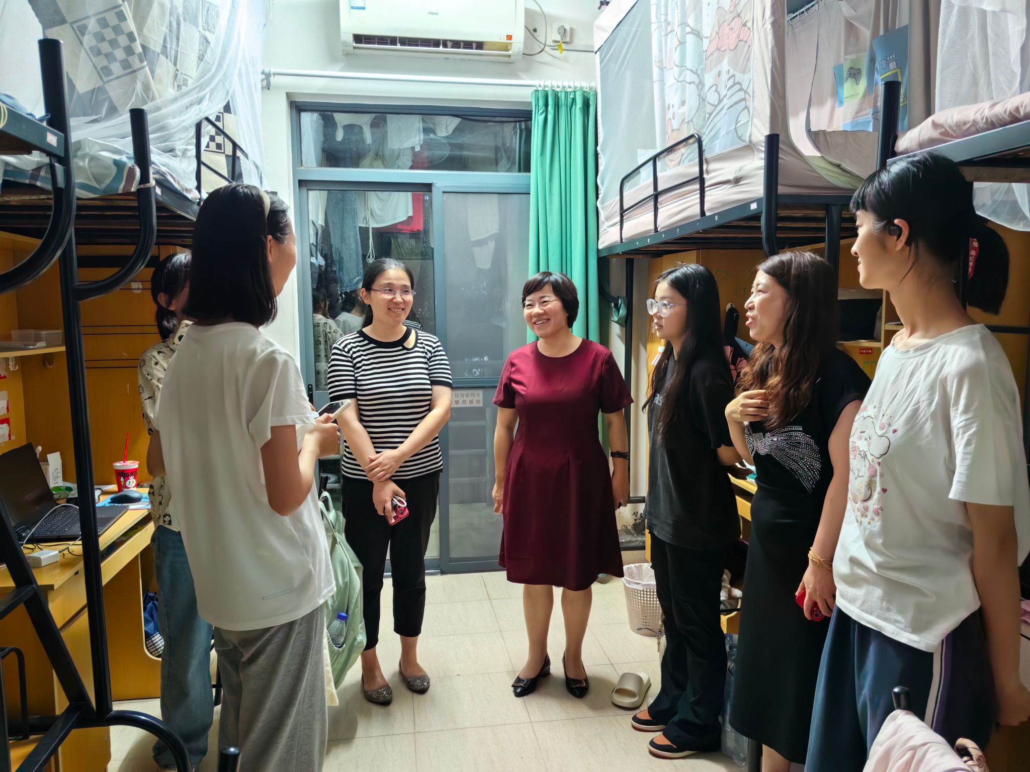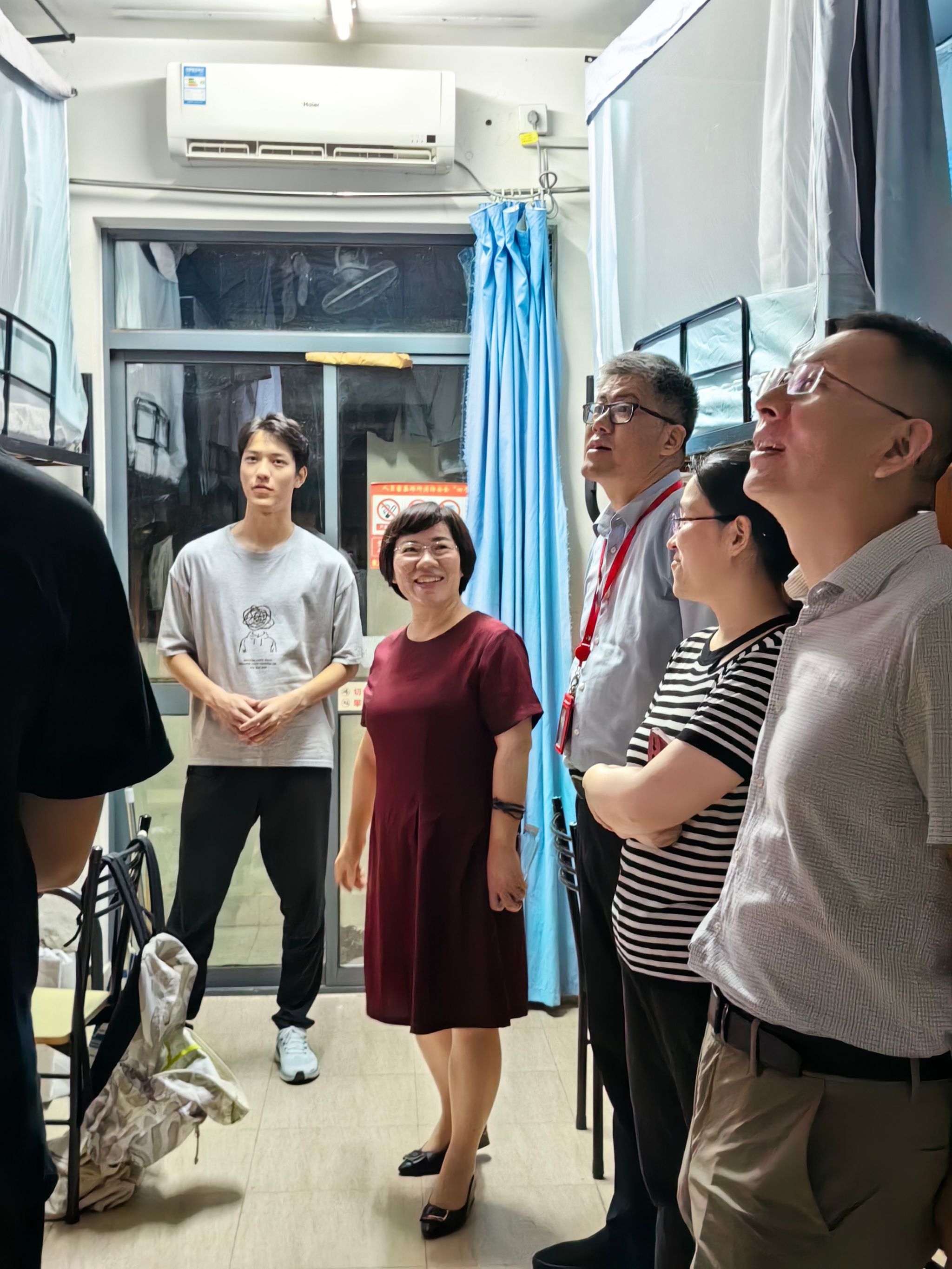 计算机学院党委书记朱宏涛,党委副书记、院长谢少荣,党委副书记、副院长赖练、副院长辛立明等学院领导与辅导员李兆燕、艾敏来到了新生宿舍,悉心询问了新生的入住情况,进行了热切地交流和亲切问候。希望同学们尽快做好角色转变,学好专业、强化基础,也对学生关切的问题进行了现场解答。