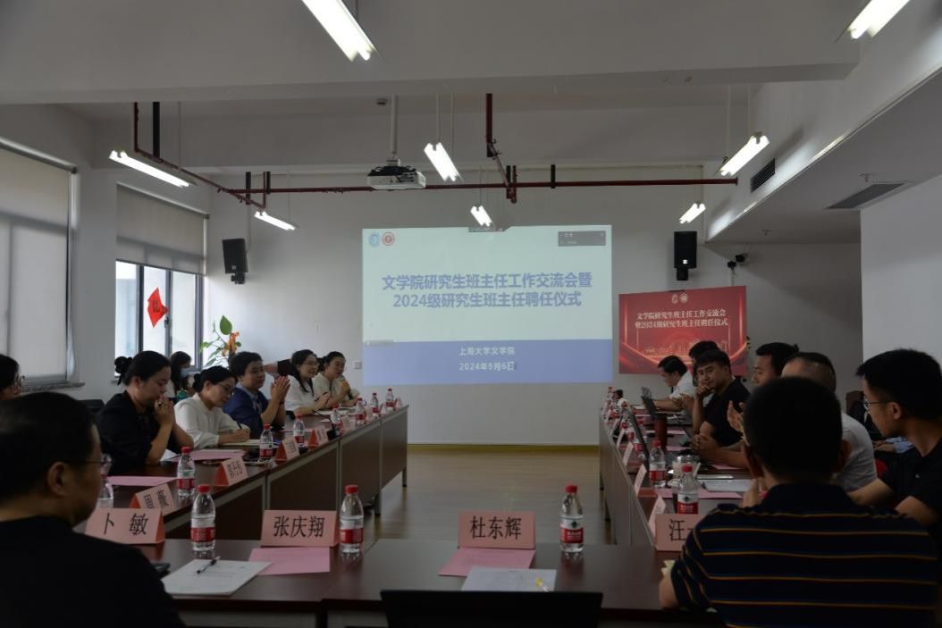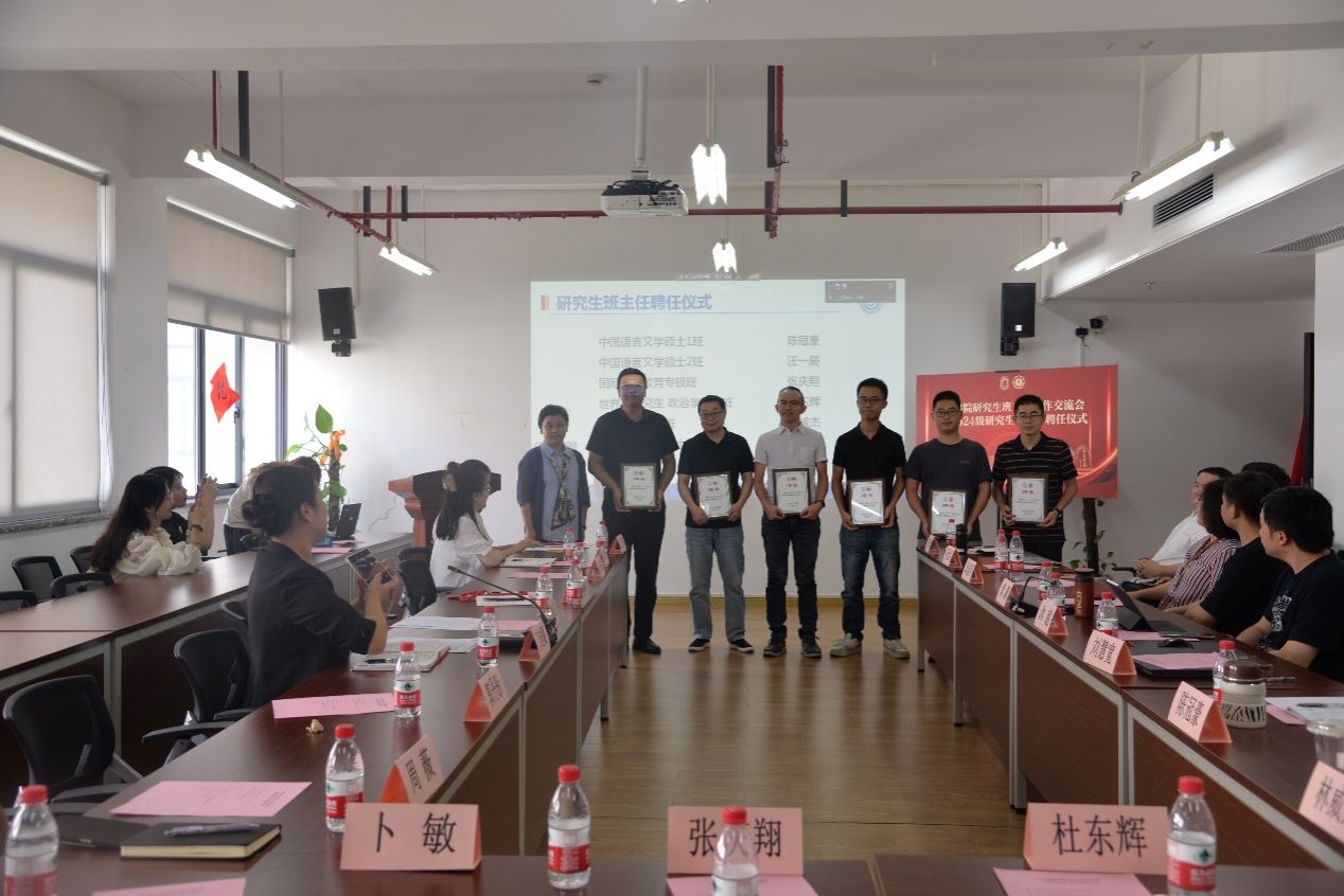 9月6日上午,文学院研究生班主任工作交流会暨2024级研究生班主任聘任仪式在文学院406会议室举行。党委研究生工作部部长魏宏,文学院党委书记陆甦颖,党委副书记、副院长丁佳蒙,中文系主任张永禄,历史系主任郭丹彤,2023级研究生班主任肖有志、邱金萍、聂世昌、黄潇、叶鹏、沐越,拟聘的2024级研究生班主任刘慧宽、陈冠豪、林威杰、汪一辰、杜东辉、张庆翔,团委书记宋亚丽,研究生教学秘书周薇,研究生辅导员刘菁、卜敏以及2024级研究生代表出席本次会议。会议由研究生辅导员刘菁主持。