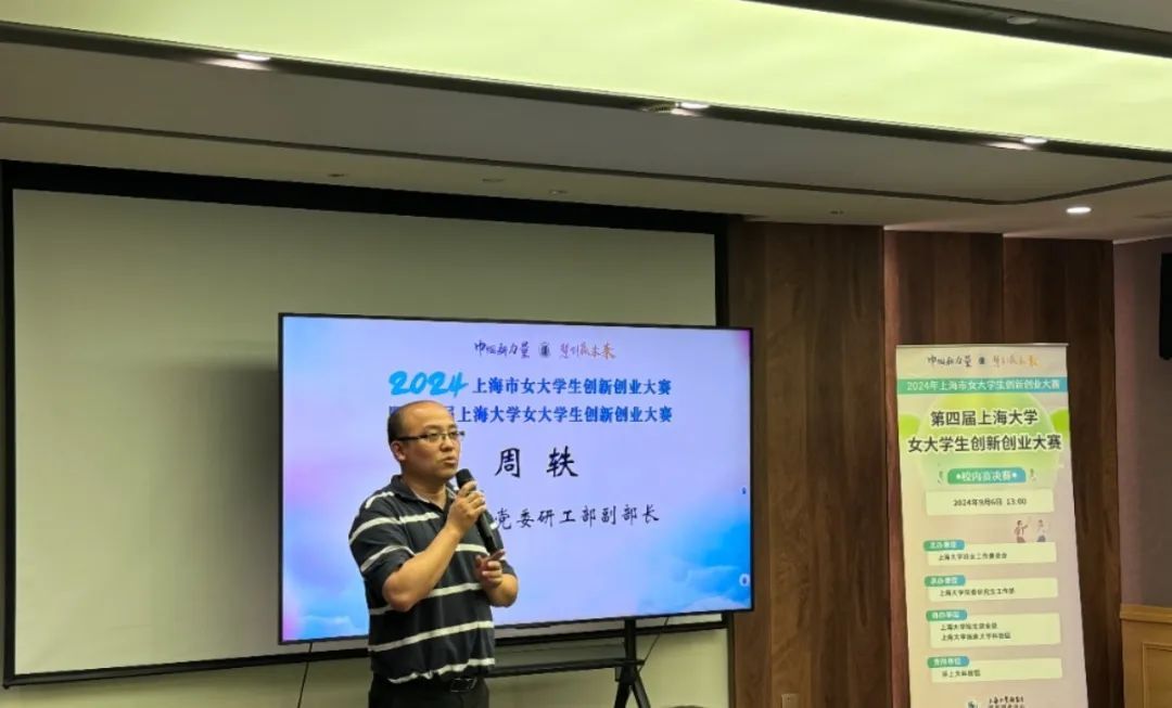 党委研工部副部长周轶老师介绍了本次大赛的组织情况并表示,此次女大学生创新创业大赛为同学们提供了一个非常好的学习交流平台,他鼓励大家在比赛的舞台上能够展现出自己的实力和风采;最后对来到现场的评委和指导老师表示衷心的感谢。