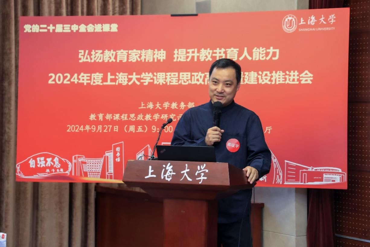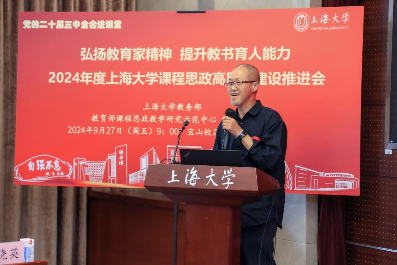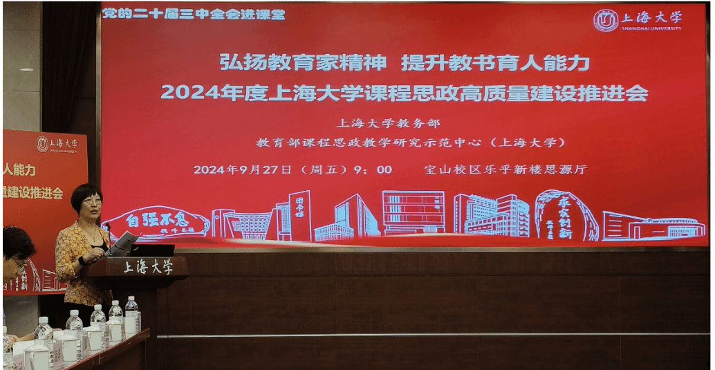 为进一步推动党的二十届三中全会精神进课堂,总结和展示ac米兰官网中文网站今年课程思政建设教育教学成果,强化教育家精神引领,提升教师教书育人能力,9月27日上午,2024年度ac米兰官网中文网站课程思政高质量建设推进会在ac米兰官网中文网站宝山校区举行。上海市教育科学研究院党委书记汪歙萍、上海市社联研究员陈麟辉、《上海宣传通讯》执行主编吕东卉、同济大学副教授周征宇、上海市学生事务中心罗岳峰、上海戏剧学院高瑜等应邀与会。ac米兰官网中文网站党委常委、副校长聂清,校党委常委、统战部部长、党委教师工作部部长曹为民,党委教师工作部副部长张富文,党委宣传部副部长、融媒体中心主任卢吉超,党政办副主任、法务办主任陈敬根,机关党委副书记郑亮,出版社社长余洋,研究生院王小丽等出席。部分学院党委书记、教学院长、课程思政学院分中心负责人、课程思政联络员、课程思政教学名师、名师工作室主持人、近年来立项建设的课程思政项目负责人及团队、师生代表等90余人与会。会议由ac米兰官网中文网站教务部主办,教育部课程思政教学研究示范中心(ac米兰官网中文网站)承办。教务部副部长、课程思政教学研究中心负责人顾晓英主持会议。