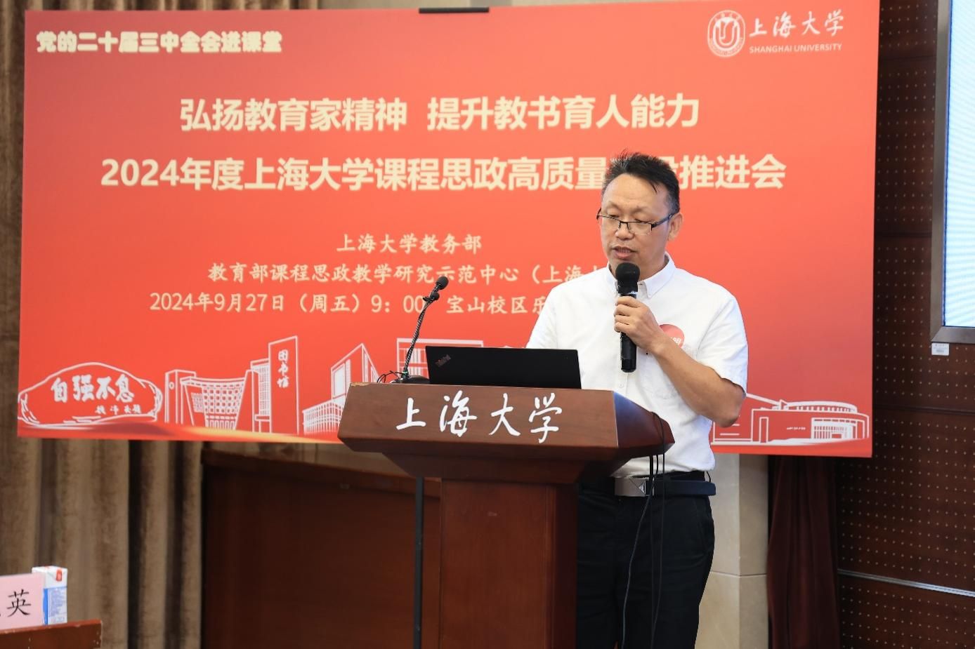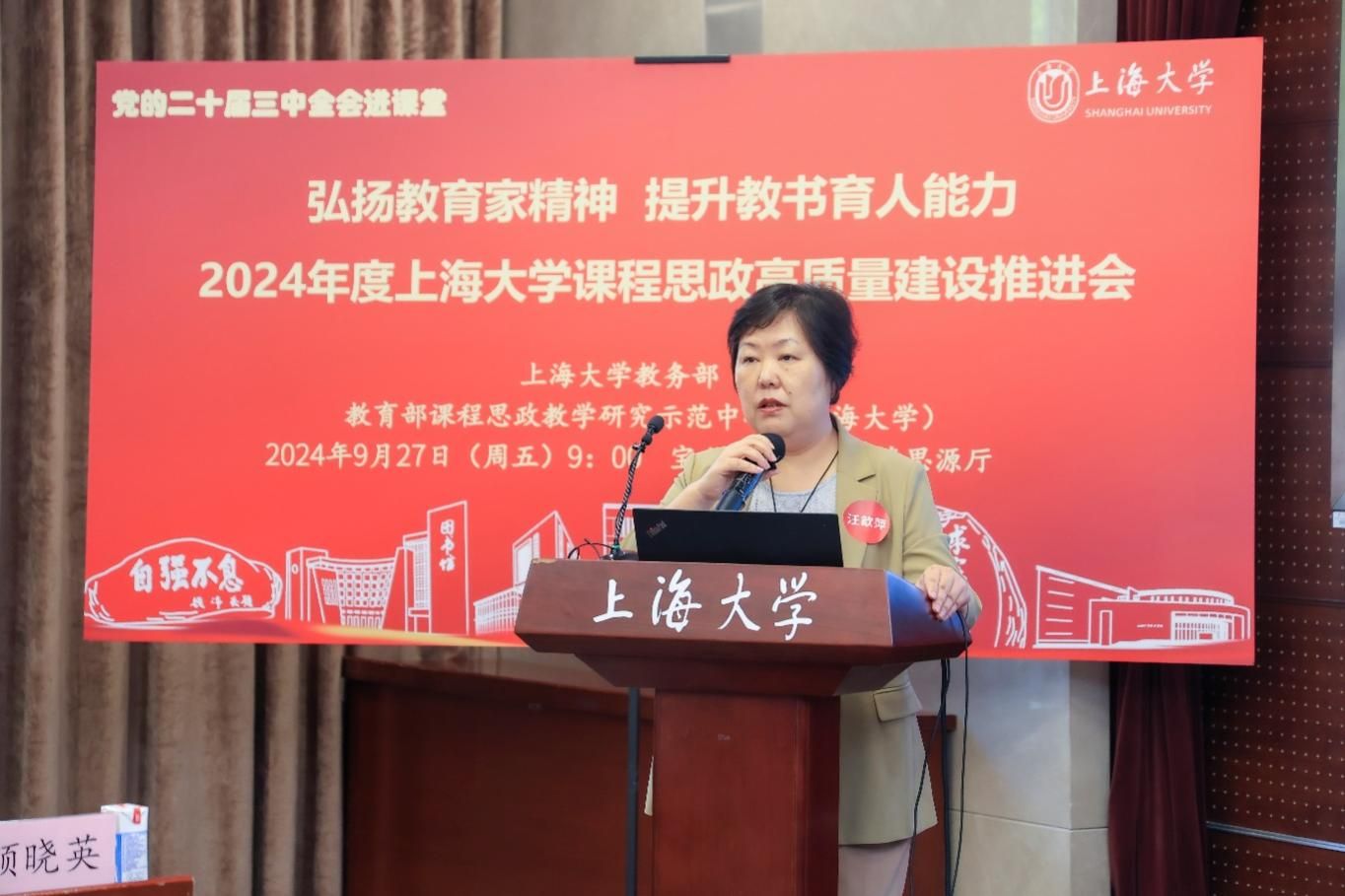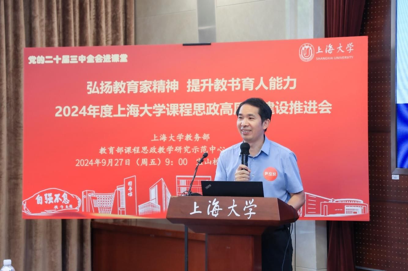 为进一步推动党的二十届三中全会精神进课堂,总结和展示ac米兰官网中文网站今年课程思政建设教育教学成果,强化教育家精神引领,提升教师教书育人能力,9月27日上午,2024年度ac米兰官网中文网站课程思政高质量建设推进会在ac米兰官网中文网站宝山校区举行。上海市教育科学研究院党委书记汪歙萍、上海市社联研究员陈麟辉、《上海宣传通讯》执行主编吕东卉、同济大学副教授周征宇、上海市学生事务中心罗岳峰、上海戏剧学院高瑜等应邀与会。ac米兰官网中文网站党委常委、副校长聂清,校党委常委、统战部部长、党委教师工作部部长曹为民,党委教师工作部副部长张富文,党委宣传部副部长、融媒体中心主任卢吉超,党政办副主任、法务办主任陈敬根,机关党委副书记郑亮,出版社社长余洋,研究生院王小丽等出席。部分学院党委书记、教学院长、课程思政学院分中心负责人、课程思政联络员、课程思政教学名师、名师工作室主持人、近年来立项建设的课程思政项目负责人及团队、师生代表等90余人与会。会议由ac米兰官网中文网站教务部主办,教育部课程思政教学研究示范中心(ac米兰官网中文网站)承办。教务部副部长、课程思政教学研究中心负责人顾晓英主持会议。