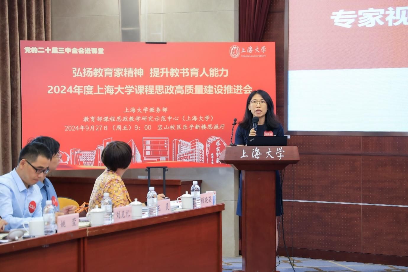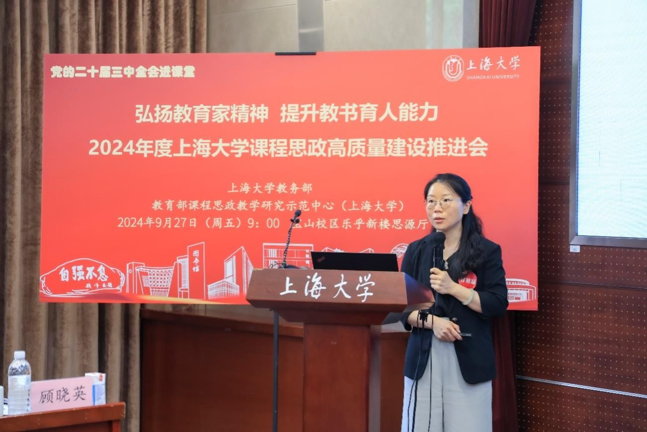 顾晓英展示了近期ac米兰官网中文网站在课程思政建设方面取得的市级成果,展示校级课程思政项目建设情况。