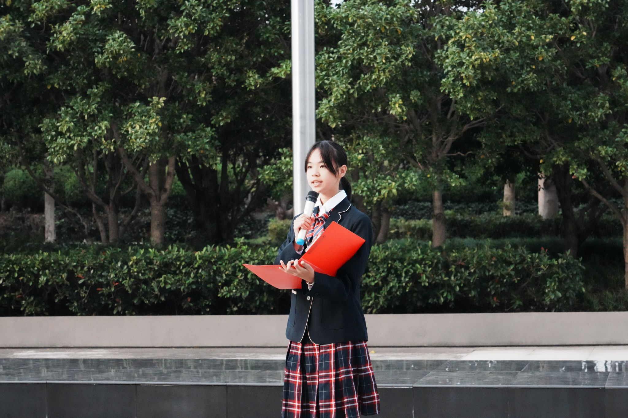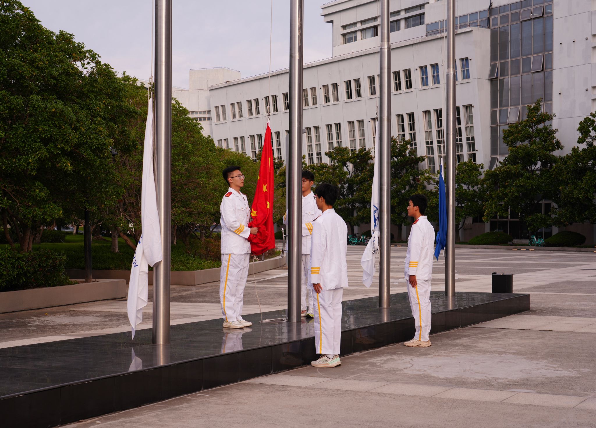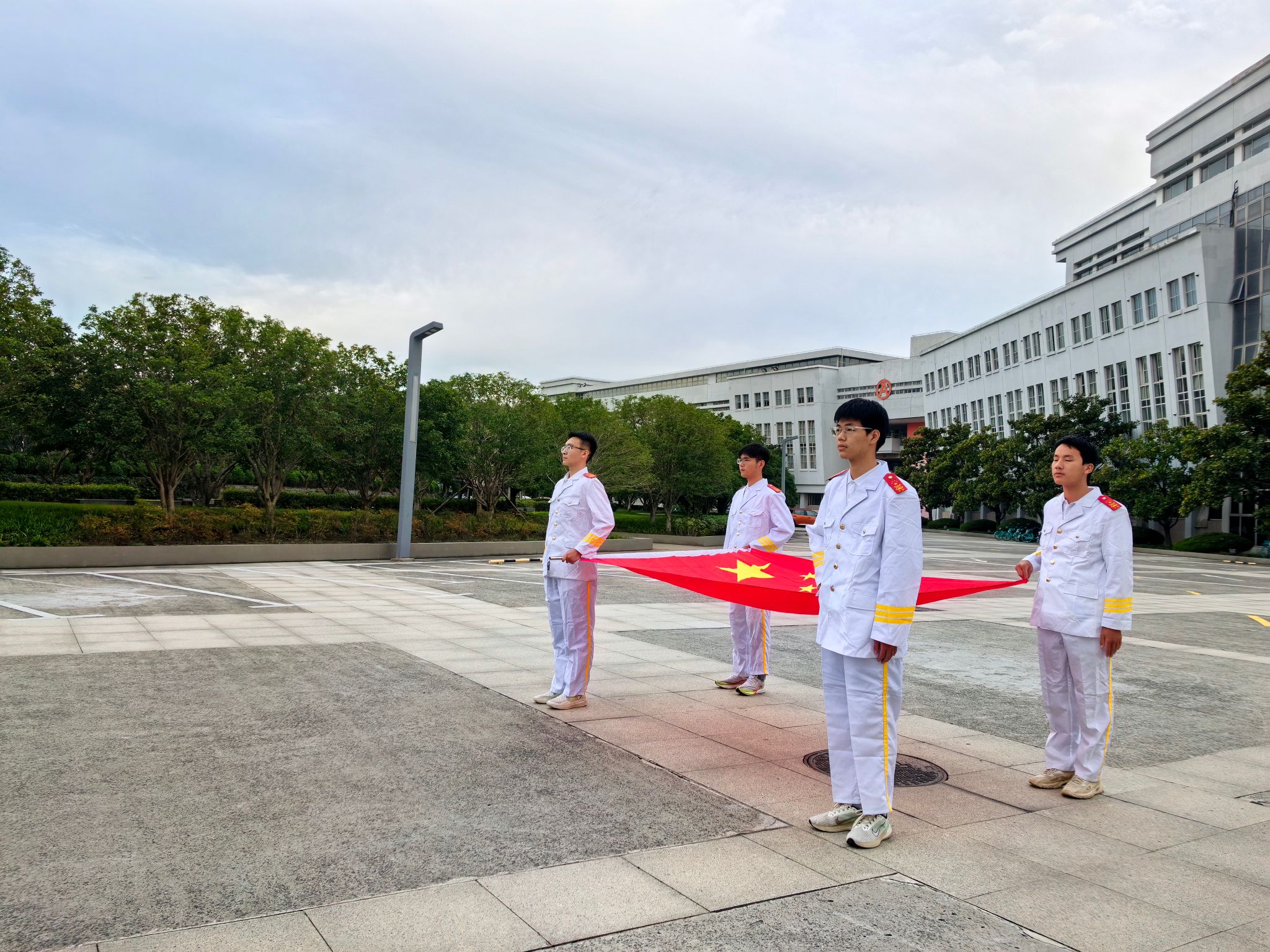 升旗仪式伊始,国旗卫士班旗手代表护送国旗入场,在全体师生的注视下,进行了庄严而肃穆的国旗、校旗升旗仪式。