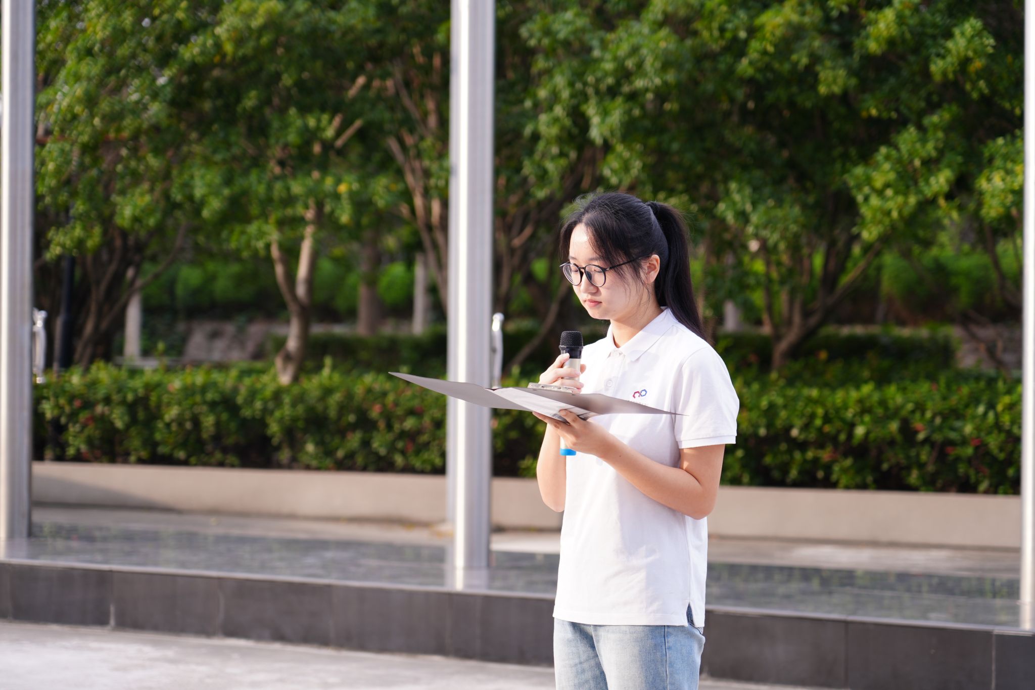 随后,钱伟长教育理念学生宣讲团的代表丁宁舒同学为大家带来题为《追寻钱老足迹,铸就科技梦想》的演讲,她以暑假期间参与学院组织的“钱老西南地区足迹探访”和“力学专业赴中国科技城绵阳实践”两场社会实践活动的感受引入,向大家介绍了始终伴随着钱老成长的爱国精神和科技报国的理念,呼吁上大人以钱老校长为榜样,继承和发扬钱老的爱国精神,以上大精神为笔,以科技创新为墨,共同绘就中华民族伟大复兴的壮美蓝图。