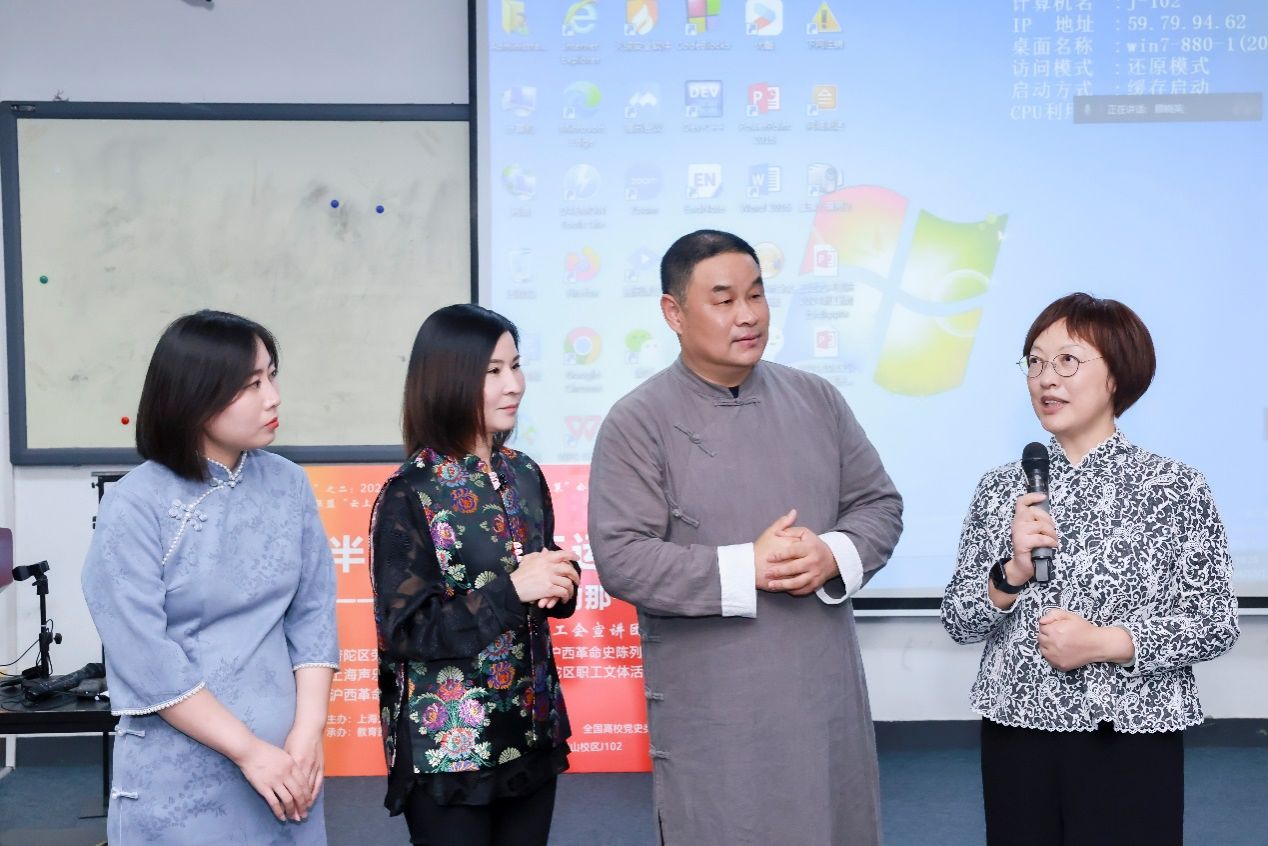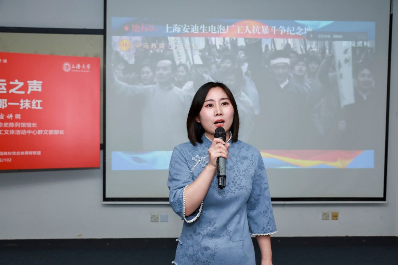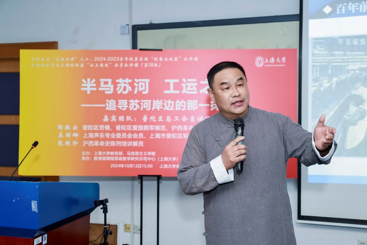 10月12日下午,一堂名为“半马苏河,工运之声”的“形势与政策”思政大课在ac米兰官网中文网站宝山校区J102开讲。课程由普陀区总工会宣讲团的普陀区劳动模范、普陀区爱国拥军模范、沪西革命史陈列馆馆长陶振云,上海声乐专业委员会会员、上海市普陀区职工文体活动中心群文部部长奚丽娜,沪西革命史陈列馆讲解员张明珍等担任嘉宾主讲。本次课旨在深化活化爱国主义教育,赓续红色血脉,弘扬劳模精神,课馆协同育人讲好“大思政课”。公开课由ac米兰官网中文网站教务部、马克思主义学院联合主办,教育部课程思政教学研究示范中心(ac米兰官网中文网站)、全国高校党史类课程联盟联袂承办。教育部课程思政教学研究示范中心(ac米兰官网中文网站)负责人顾晓英、教务部教学运行处处长袁晓君全程参与互动。