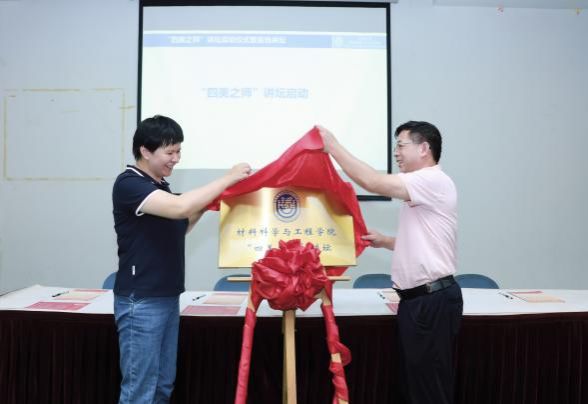 活动伊始,黄健向与会人员介绍学院“四美之师”师德师风教育品牌的设立背景。“各美其美、美人所美、成人之美、合和共美”是材料学院的优秀文化。自学院原党委书记朱明原、原院长鲁雄刚两位教授集全院教师的智慧提出之后,材料人始终传承、坚持四美文化,开展育人实践,政治坚定、爱岗敬业的优秀教师不断涌现。学院设立“四美之师”讲坛,展示优秀教师立德树人、自强不息、道济天下的精神风貌;聘任“四美好导师”,带教新进教师,提升青年教师的育人能力。接着,由孙琦琰副部长和学院执行院长钟云波为“四美之师”讲坛揭牌。
