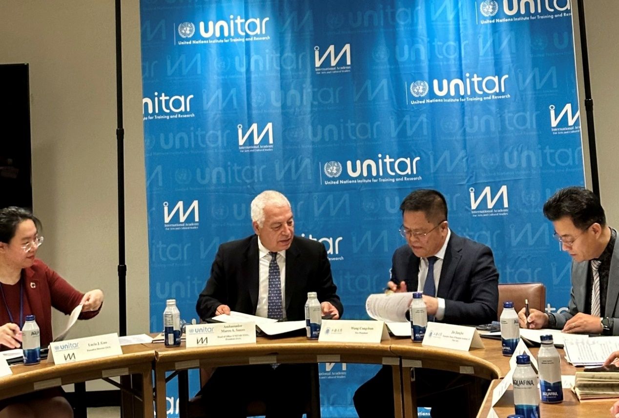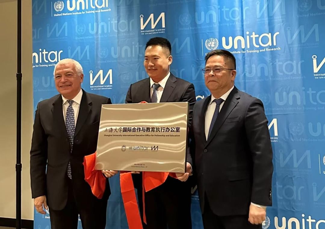 在纽约,代表团访问了联合国训练研究所及其所属的全球文化与艺术组织。王从春副校长与联合国训练研究所所长、全球文化与艺术组织主席Marco A. Suazo大使进行了会晤。双方共同签署了谅解备忘录,并为“ac米兰官网中文网站国际合作与教育执行办公室”揭牌。双方就后续合作进行了深入交流,将共建国际文化、科技和艺术教育中心,全球城市更新与可持续发展学术智库,助力ac米兰官网中文网站培养国际组织人才。
