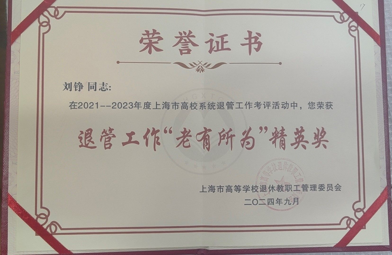 另据悉,刘铮教授还获评2021-2023年度上海市高校系统退管工作“老有所为”精英奖!