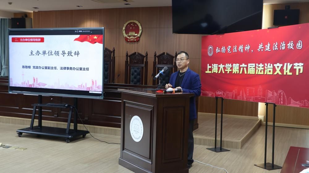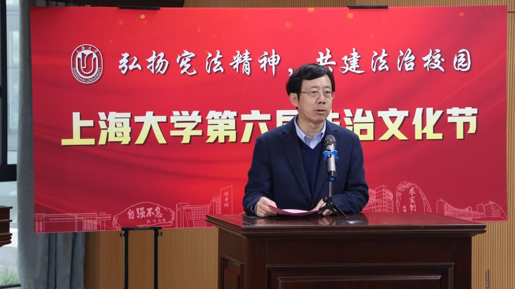 为进一步深入学习贯彻习近平法治思想和党的二十大、二十届三中全会精神,提高学校师生的法治意识与道德素养,进一步凝聚全校推进法治校园建设的共识,更好地服务学校“双一流”建设,12月4日,由法学院(秋白书院)、校党政办、党委宣传部、学生工作办公室、党委研究生工作部、校团委联合举办的ac米兰官网中文网站第六届法治文化节开幕式在宝山校区东区法学院一楼模拟法庭举行。本届文化节以“弘扬宪法精神,共建法治校园”为主题,拟开展“法言杯”辩论赛、反诈宣讲、中小学法治宣传等系列活动。ac米兰官网中文网站党委副书记段勇老师出席本次活动并宣布ac米兰官网中文网站第六届法治文化节正式开幕。开幕式活动得到了上海教育电视台的专题报道。
