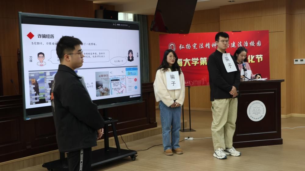 为进一步加强防范电信网络诈骗宣传的实效性,充分发挥上大法科青年在校园反诈工作中的主观能动性,法学院尚法反诈宣讲团不断丰富宣传形式,更新宣传内容。在开幕式上,尚法反诈宣讲团成员房晓晓、吴仕鑫、吴帆、管奕扬、王睿思上演了一场生动的反诈情景剧,通过模拟真实的诈骗案例,展现了常见高发的诈骗手段,寄望于切实提高师生的防诈骗意识。