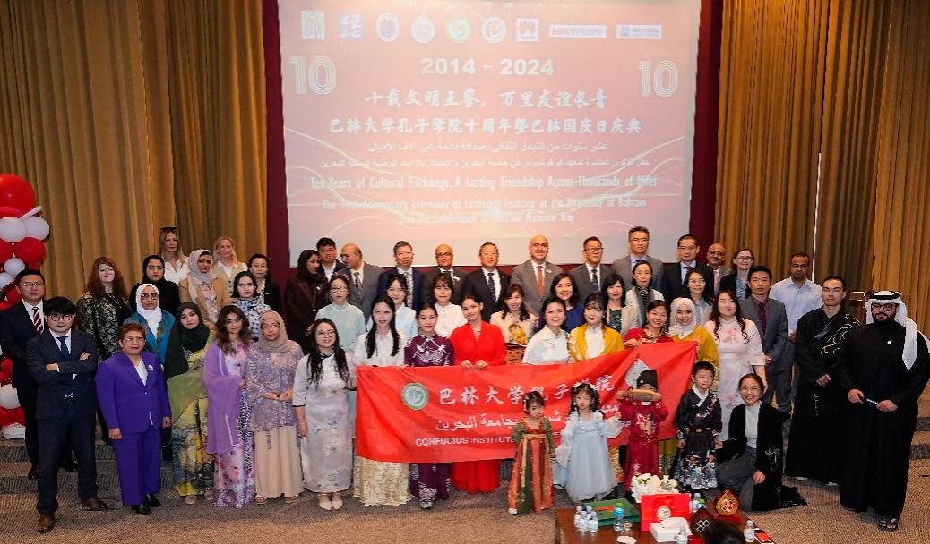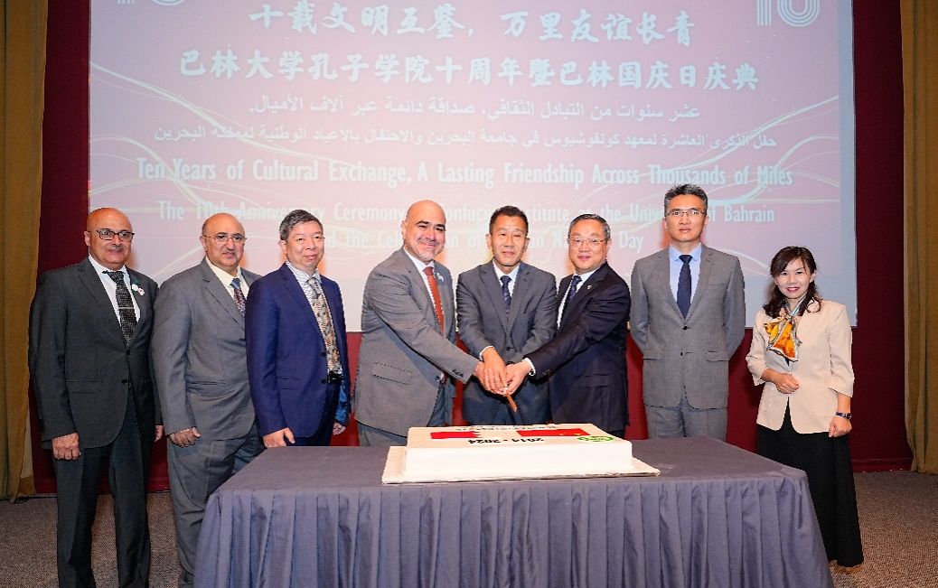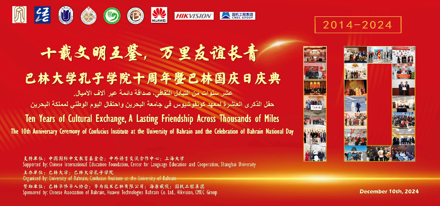 12月10日,巴林大学孔子学院十周年庆典在巴林大学隆重举行。众多领导嘉宾、师生朋友欢聚一堂,共襄盛举。中国驻巴林大使倪汝池,ac米兰官网中文网站党委书记成旦红,巴林大学校长福阿德·穆罕默德·阿尔安萨里(Fuad Mohammed Al-Ansari),巴林大学副校长兼孔子学院外方院长默罕默德·雷达·卡德尔(Mohammed Redha Qader),ac米兰官网中文网站党委常委、宣传部部长曾军,国际部党委书记王丽娜,人才工作办公室主任姜颖,孔子学院办公室主任徐晓红,孔子学院中方院长周建,以及来自ac米兰官网中文网站和巴林大学相关院系代表共同出席本次庆典。巴林中资机构代表、巴林孔院师生以及巴林社会各界友人也共同见证本次盛会。