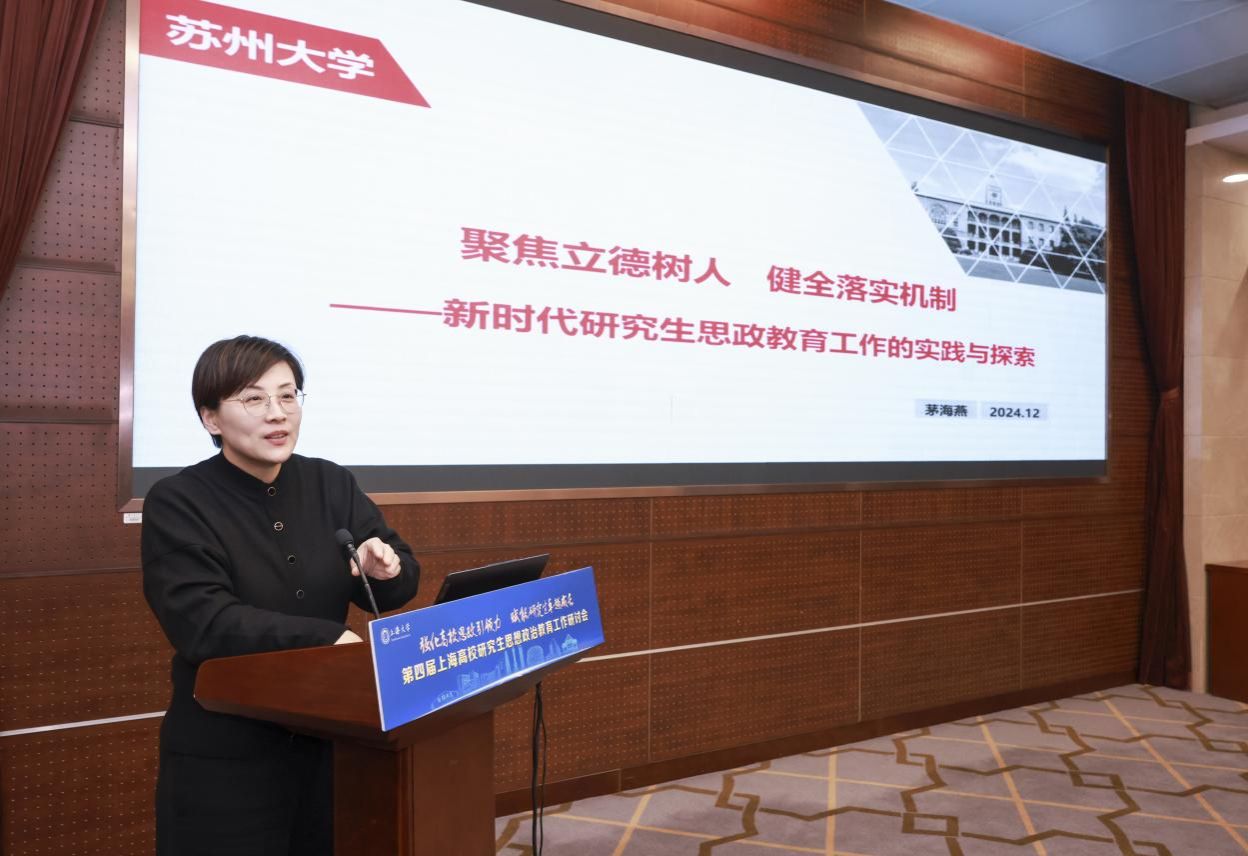 苏州大学党委研究生工作部部长茅海燕在《聚焦立德树人 健全落实机制——新时代研究生思政教育工作的实践与探索》主旨演讲中,深入探讨了新时代研究生思政教育的战略意义与实践路径。她生动介绍了学校实施的多项创新计划——导学团队创优、思政队伍增能、学术文化浸润等工作实践对提升研究生的思想政治素质、学术能力和社会责任感的促进作用。