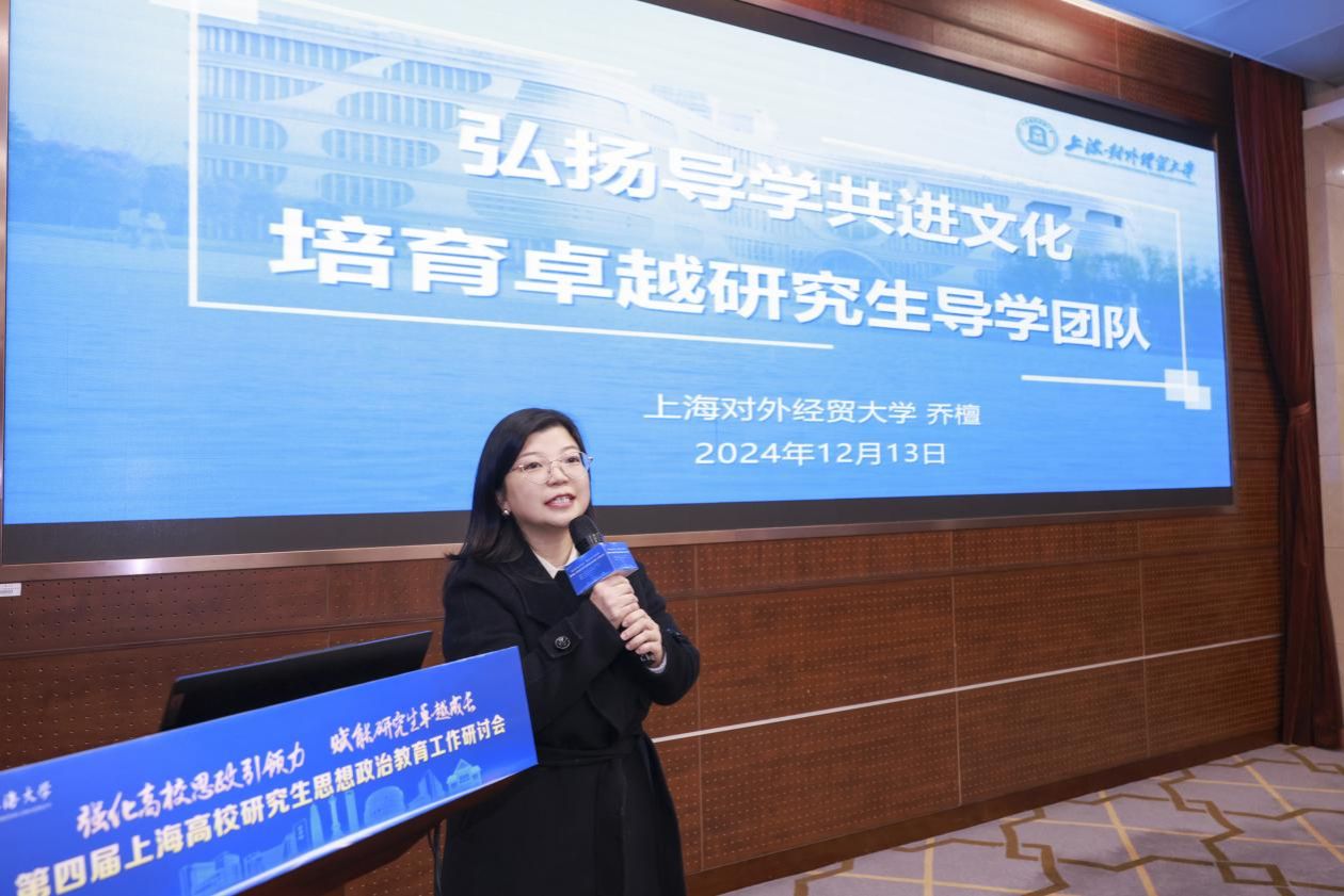 上海对外经贸大学法学院党委书记乔檀作《弘扬导学共进文化,培育卓越研究生导学团队》主题分享,介绍了学校通过“双系统”协同联动,推动思想政治教育的实施。她还阐述了学校如何通过“导学共进”文化,增强师生间的情感交流和价值共鸣,从而激发师生的创新实践能力。