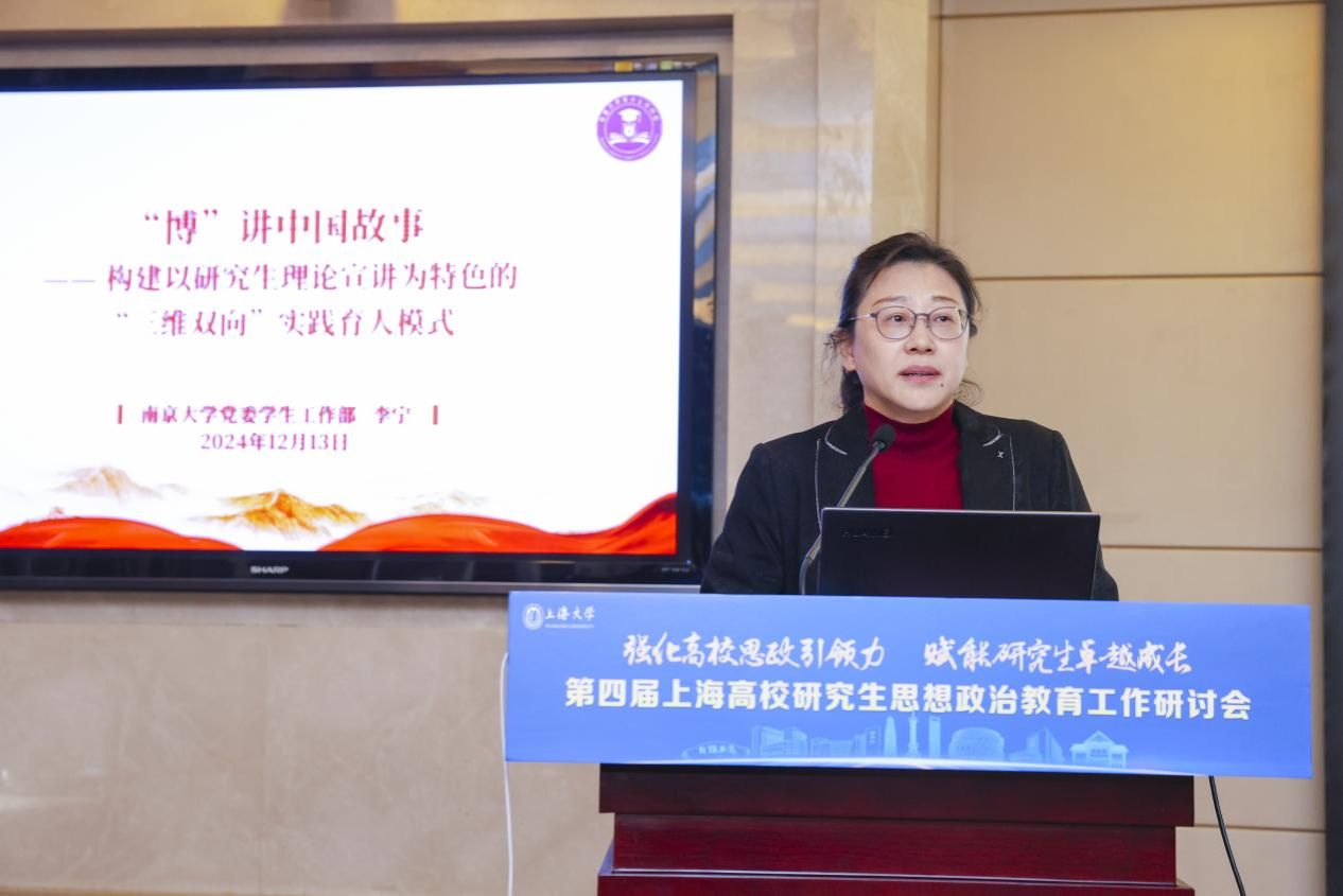 南京大学党委学生工作部副部长李宁作题为《“博”讲中国故事——构建以研究生理论宣讲为特色的“三维双向”实践育人模式》的主旨演讲。李部长以南京大学博士生讲师团的工作实践为线索,依托理论宣讲、校地合作和大思政课育人载体,深入探讨思想引领、基层实践和青年成长三维育人体系,为研究生教育创新提质提供宝贵的经验和启示。