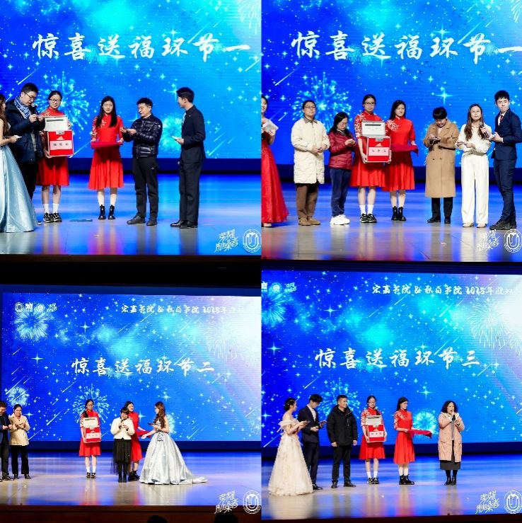 晚会还设置了趣味盎然的游戏互动及惊喜送福环节,引来同学们热情参与,嘉宾代表依次上台,为现场观众们送出四轮新年惊喜祝福,将全场气氛推向高潮。