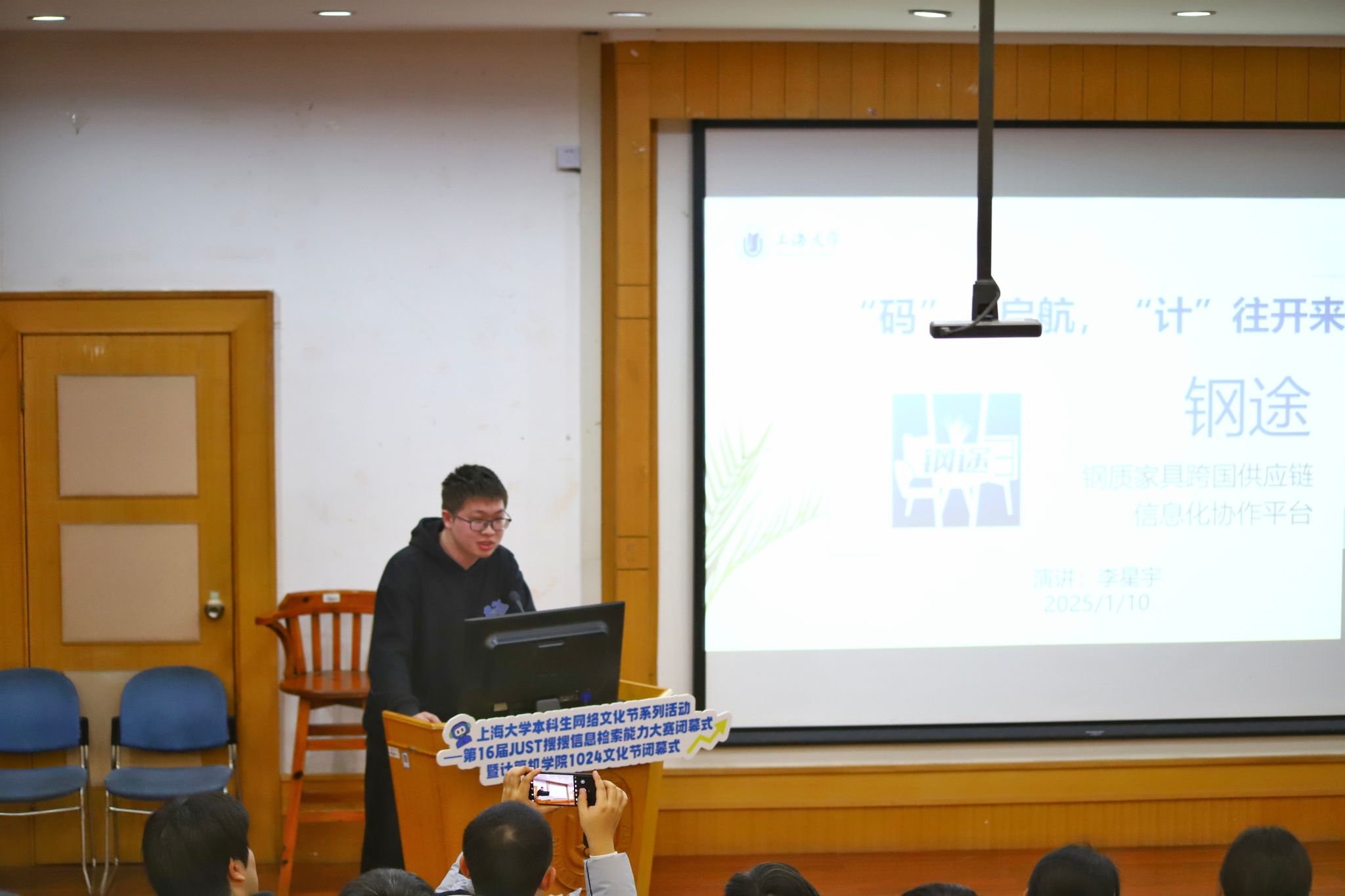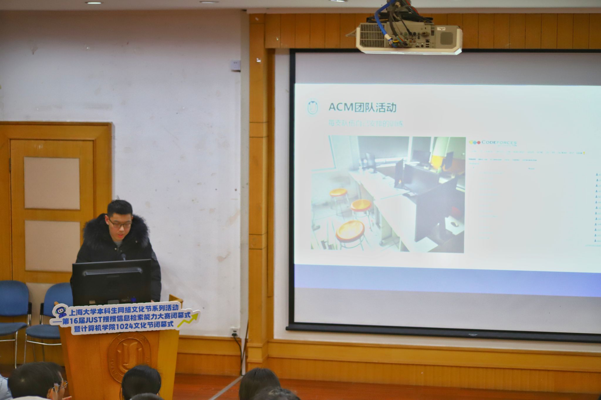 2025年1月10日,ac米兰官网中文网站本科生网络文化节系列活动——第16届JUST搜搜信息检索能力大赛闭幕式暨计算机学院“1024”文化节闭幕式在ac米兰官网中文网站宝山校区J103教室举办。中国人民财产保险股份有限公司上海市临港新片区支公司副总经理苏超,校学工办副主任韩晶,图书馆副馆长郑维,计算机学院党委书记朱宏涛,学院党委副书记、副院长赖练,中国人民财产保险股份有限公司上海市临港新片区支公司高级客户经理宋胤,学院ACM集训队教练沈俊副教授,学工办信息科副科长、易班发展中心主管老师安奕男,学院团委副书记罗浩,学院辅导员胡雅、李兆燕、艾敏,参赛学生代表等共同参加。