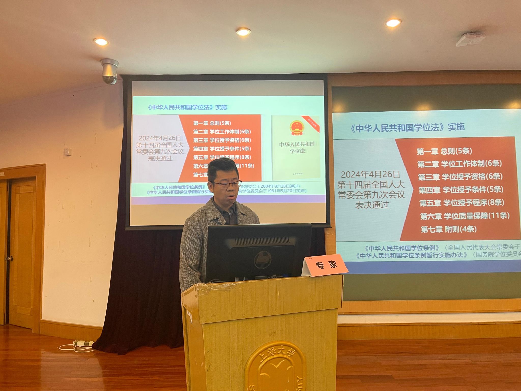3月4日,ac米兰官网中文网站《中华人民共和国学位法》专题培训会于宝山校区J202开启。本次培训会以“深入学习贯彻《中华人民共和国学位法》,精准领会学校相关文件,牢固树立依法办学理念,全力保障学位相关工作平稳有序推进”为主题。会议特邀华东师范大学高等教育研究所、教育立法研究基地教授姚荣作专题报告。ac米兰官网中文网站学位办副主任魏峭巍主持会议。ac米兰官网中文网站党委常委、副校长聂清致欢迎辞。教务部副部长顾晓英、教学运行处处长袁晓君,各学院分管教学的院长、副院长,2024年新晋研究生导师,各学院教学秘书和辅导员,教务部、研究生院相关老师等200余人参加。