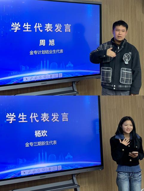 在“金专计划”学生代表发言环节,“金专计划”二期学生代表周旭与“金专计划”三期学生代表杨欢依次上台,分别从自身经历出发分享了在“金专计划”课程中收获与对“金专计划”学习的期待及取得成果的决心,展现了新一代知识产权人的活力。