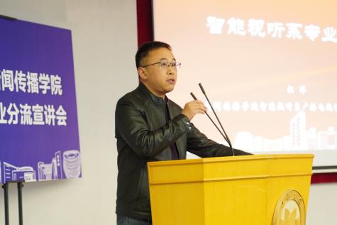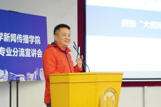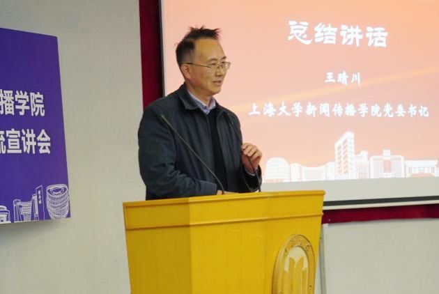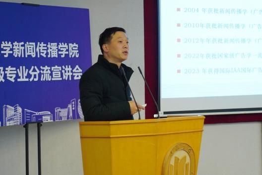 新闻传播学院党委书记王晴川教授在宣讲会上讲话。他强调,新闻传播学院办学特色鲜明且独具优势,可归结为“体制双共建、育人重实践、紧跟融媒体、突出马新观”。学院资源丰富、前景广阔、未来光明,各类实践项目、品牌活动亮点纷呈,有足够的实力为同学们搭建优质成长平台。他期待在场同学能结合自身兴趣爱好和职业规划做出智慧选择,积极加入新闻传播学院这个温暖而又充满活力的大家庭中来,共同书写精彩篇章。