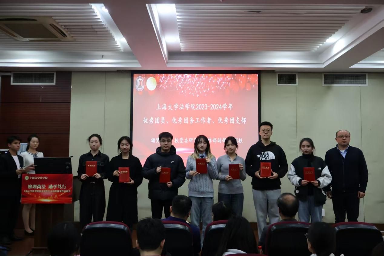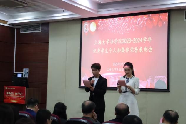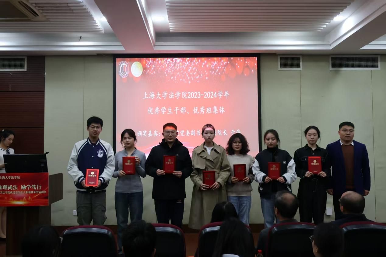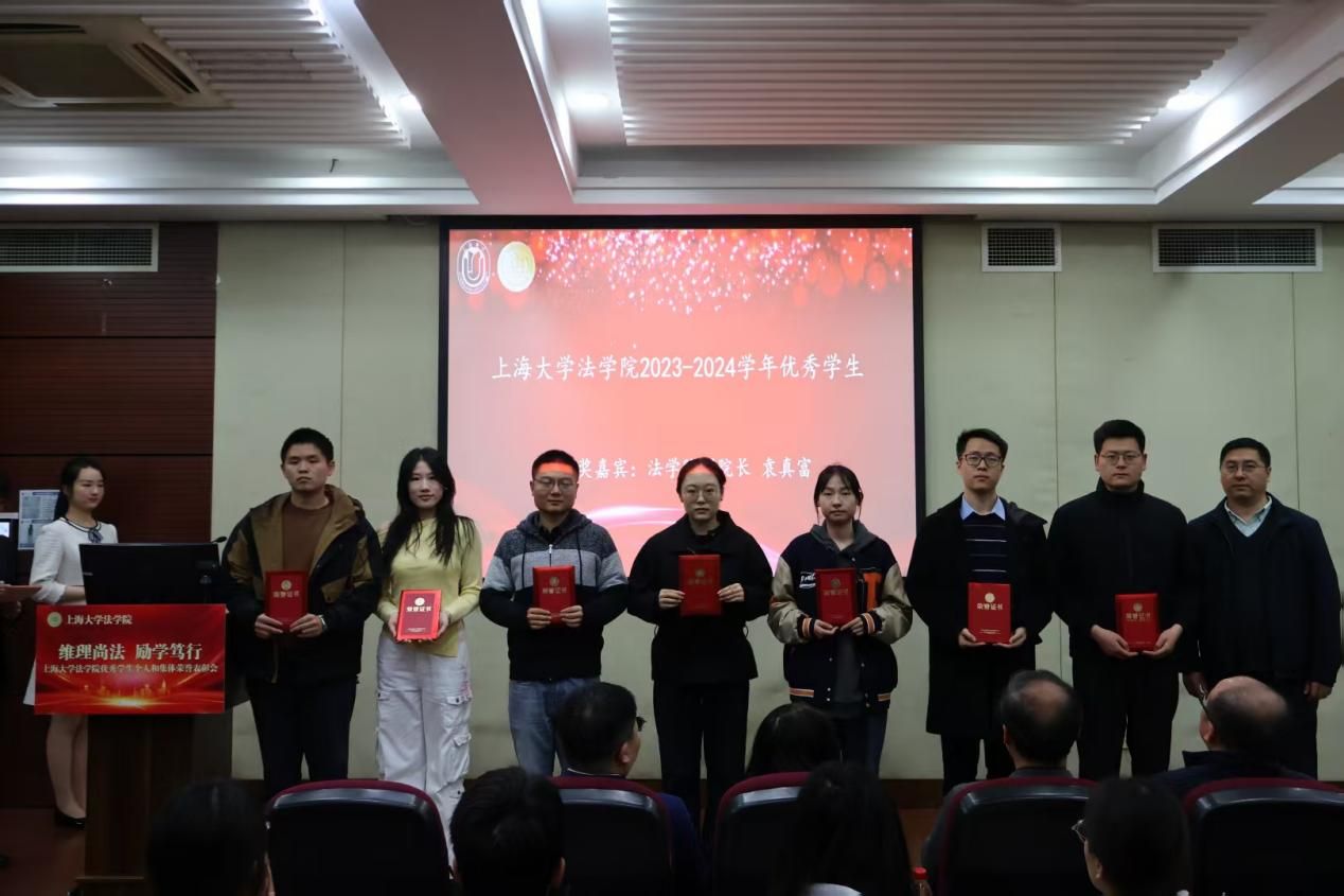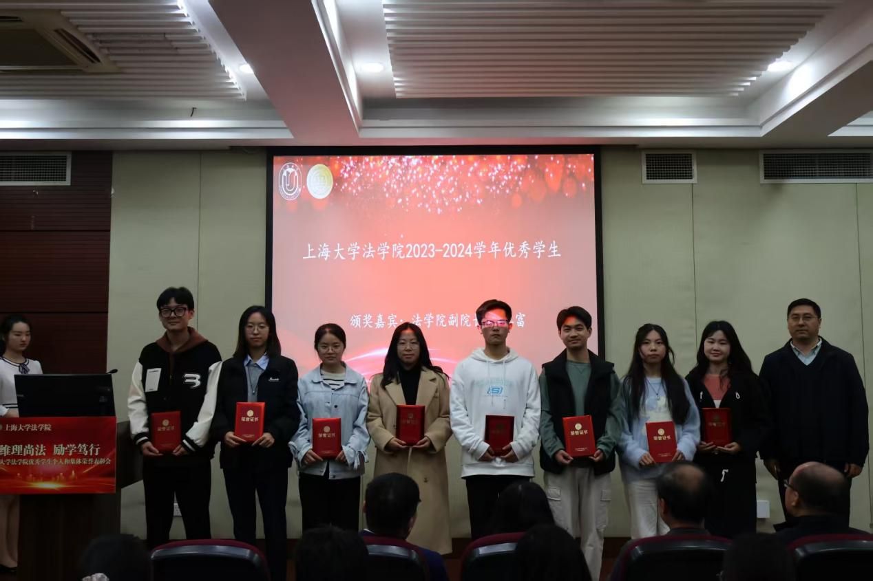 3月28日下午,法学院在宝山校区经管大楼115室举行2023-2024学年优秀学生个人和集体荣誉表彰大会。ac米兰官网中文网站学生工作办公室副主任韩晶、ac米兰官网中文网站党委研究生工作部副部长周轶,ac米兰官网中文网站法学院党委书记徐国明,法学院二级教授文学国,法学院党委副书记、副院长于伟,法学院副院长、知识产权学院院长袁真富以及学院各年级的辅导员老师、获奖学生以及各年级学生代表参加表彰大会。本次表彰大会由法学院研究生王睿思和本科生严嘉轩同学主持。
