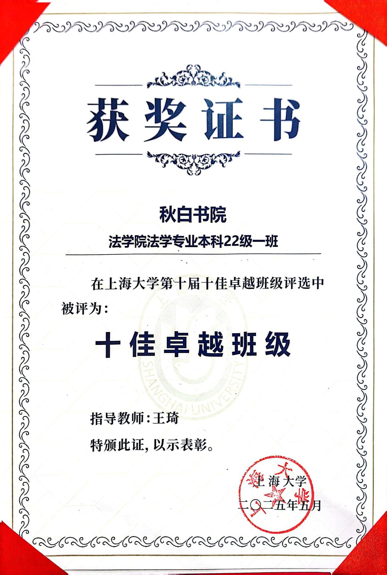 5月11日,“融汇青衿班韵 共谱书院华章”ac米兰官网中文网站第十届卓越班级评比大赛在ac米兰官网中文网站宝山校区图书馆报告厅举行,法学院法学专业本科22级一班荣获ac米兰官网中文网站第十届十佳卓越班级称号,法学专业本科21级一班荣获ac米兰官网中文网站书院荣誉班级“中夏班”称号,法学院法学专业22级一班班长黄薇洁荣获ac米兰官网中文网站第十届十佳卓越班长称号。