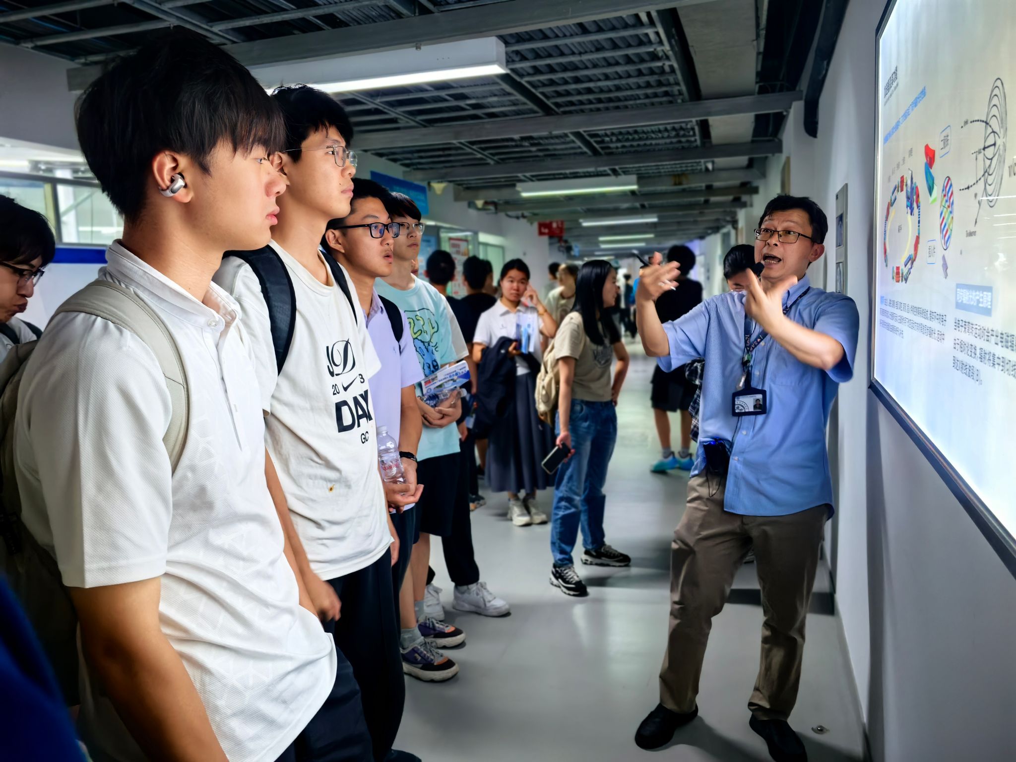王勇老师从上海光源的创立缘起、建设历程娓娓道来,提到它作为中国大陆第一台第三代同步辐射光源,总体性能居国际同类先进水平,还介绍二期工程完成后34线46站运行等情况。逐步深入剖析其核心工作原理,借助“从‘三体’讲起”等有趣关联,细致解读同步辐射光源的产生机制——通过磁场改变电子运动方向,一对或多对磁铁偏转电子产生同步辐射,以及同步辐射作为电磁波,从麦克斯韦、普朗克到爱因斯坦等对其理论奠基的相关知识,还有在探索微观世界“超级显微镜”等应用场景。他还重点介绍了上海光源在物理学、生物学、材料科学等学科的突破性成果,涵盖高精度晶体结构解析、EUV光刻胶技术突破(如实现EUV掩模缺陷48.5nm检测分辨率),以及生物大分子研究的重要进展等。同时提及上海光源年接待用户超10000人次、年均发表SCI文章超1500篇等运行成果,丰富的讲解内容,让同学们对上海光源的前沿科技有了更为深刻的理解,也明晰了同步辐射技术未来“上海新一代同步辐射光源”等发展前景。