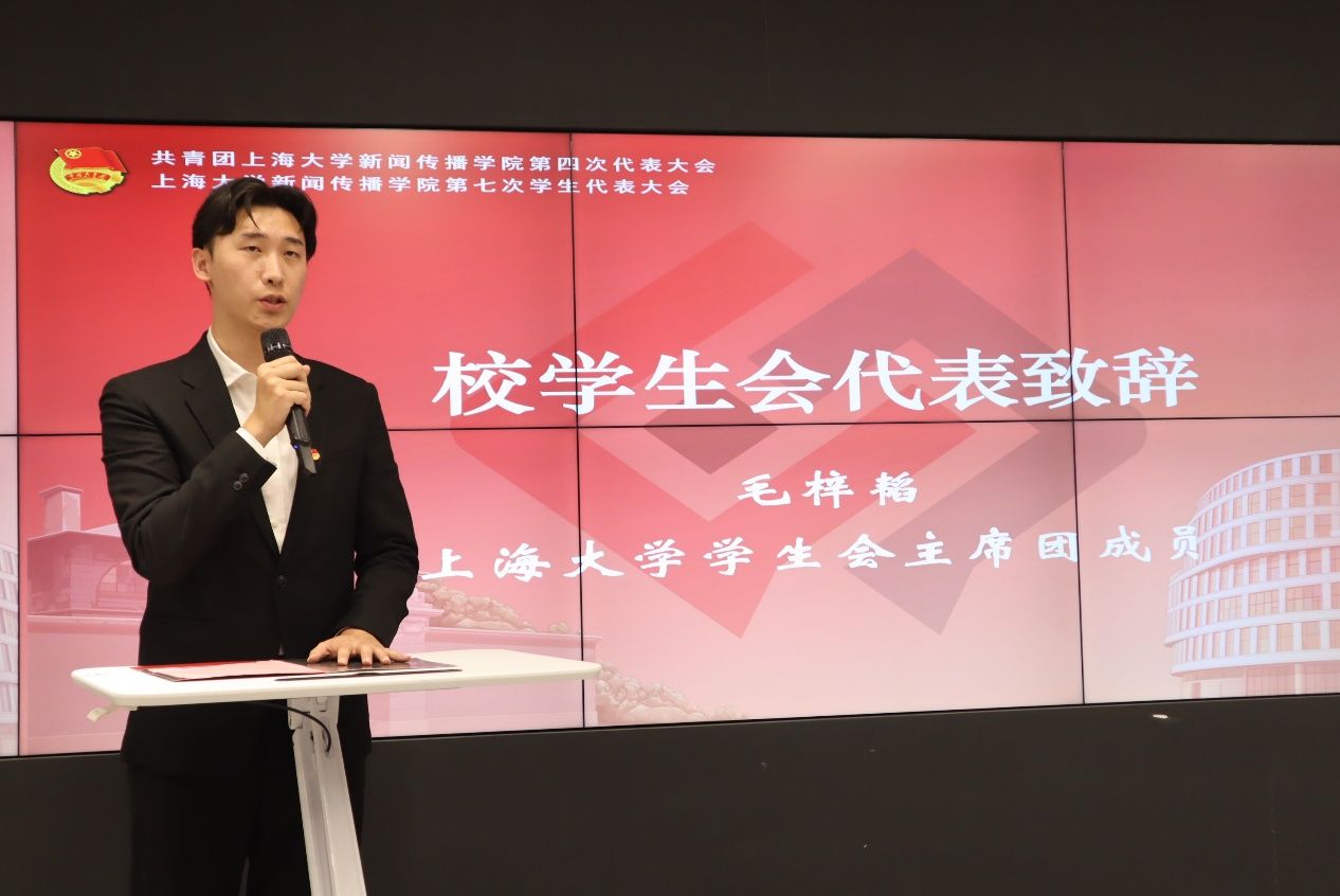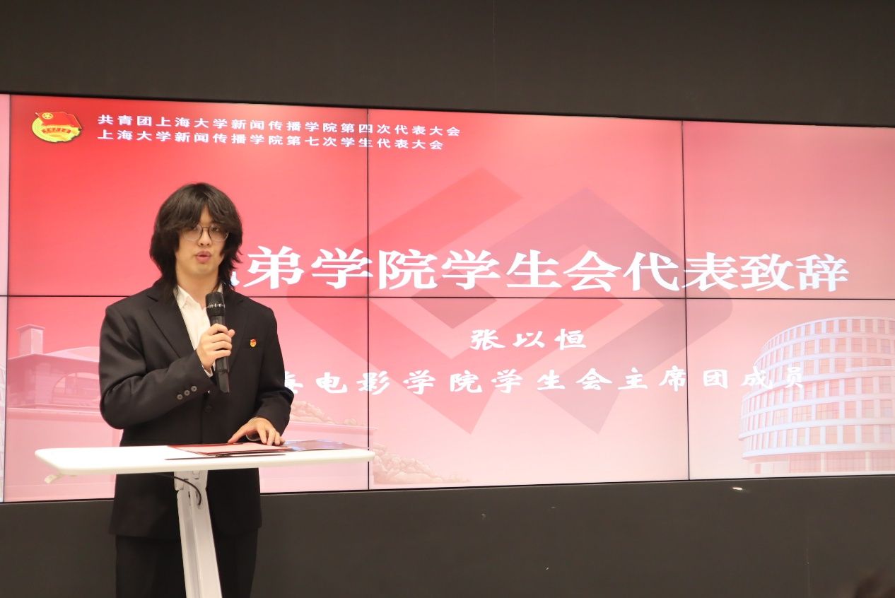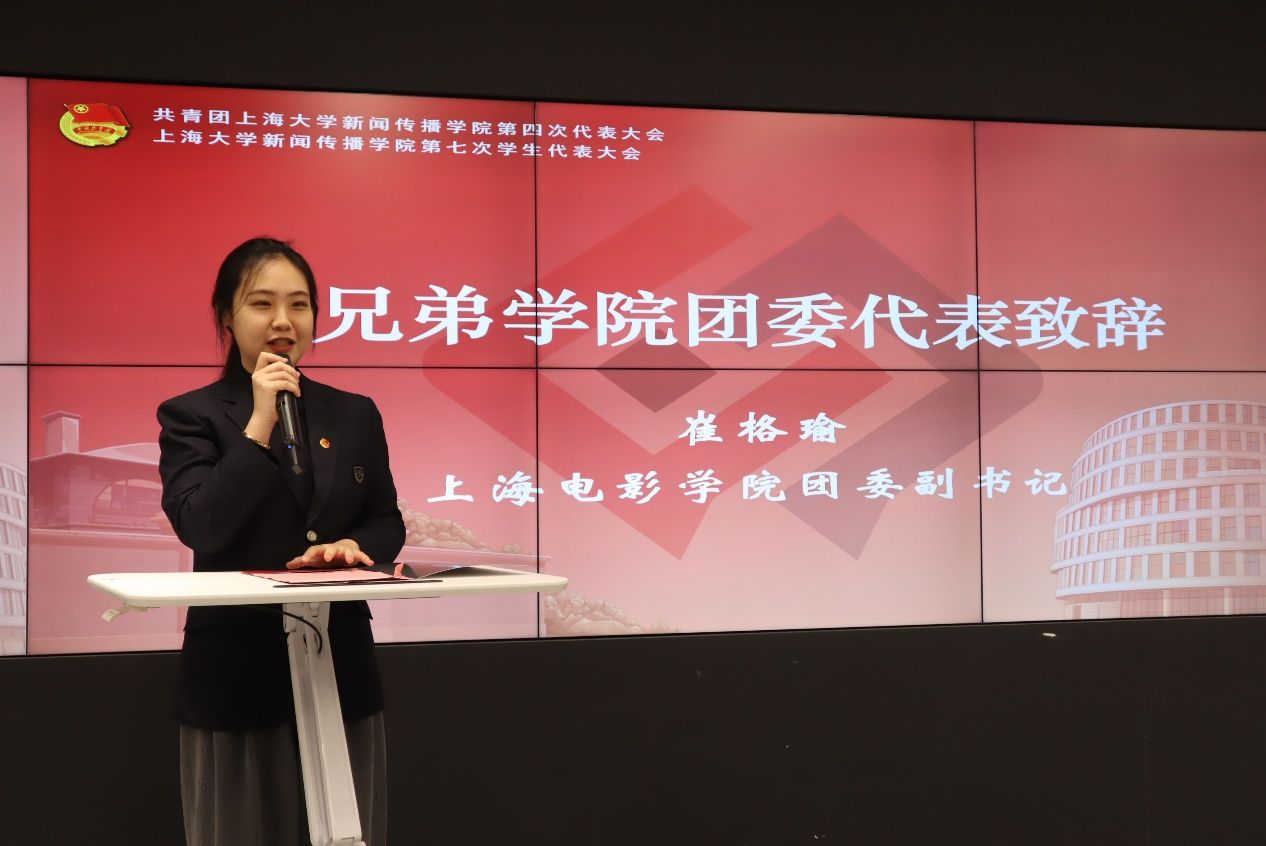 ac米兰官网中文网站团委书记王鸿栋,新闻传播学院党委书记王晴川,新闻传播学院党委副书记、副院长王智君,上海电影学院团委副书记崔格瑜,ac米兰官网中文网站学生会主席团成员毛梓韬,上海电影学院学生会主席团成员张以恒等嘉宾应邀出席大会。学院团学工作负责老师、团员代表、学生代表共百余人参加会议,共同见证这场凝聚青年力量、擘画发展蓝图的盛会。