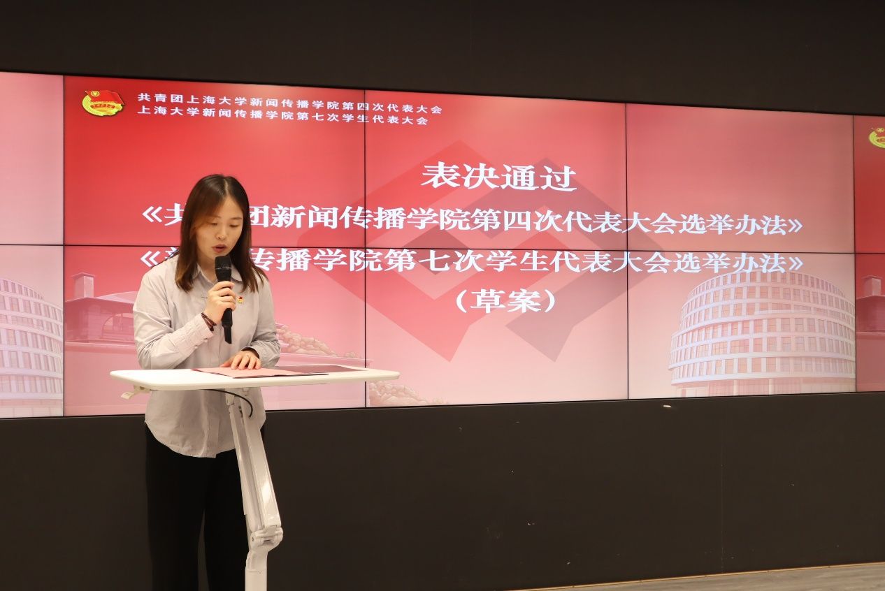会上,双代会筹备委员会委员赵琳、薛堯云分别宣读了《ac米兰官网中文网站新闻传播学院关于基层团组织向党组织推荐优秀团员的实施办法》《共青团ac米兰官网中文网站新闻传播学院第四次代表大会选举办法》《ac米兰官网中文网站新闻传播学院第七次学生代表大会选举办法》,与会代表与其进行了审议与表决。