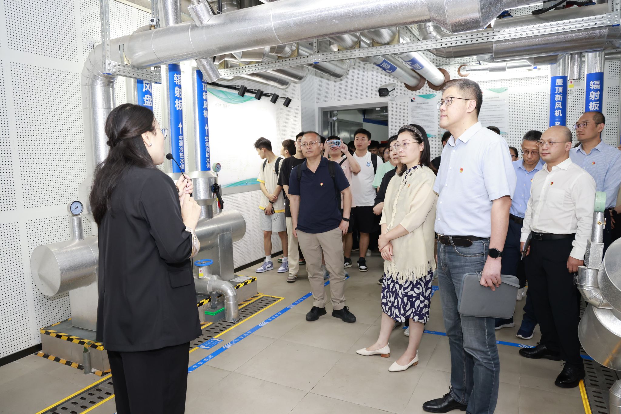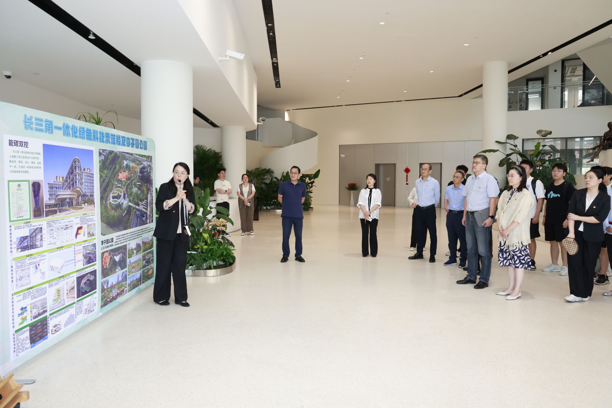 在上海建工羿云科技党支部书记、总经理钱芸陪同下,ac米兰官网中文网站计算机学院党委书记朱宏涛,党委副书记、副院长赖练,副院长李晓强及青年教师、学生代表与羿云科技党员共同参观了长三角绿色科技示范楼。