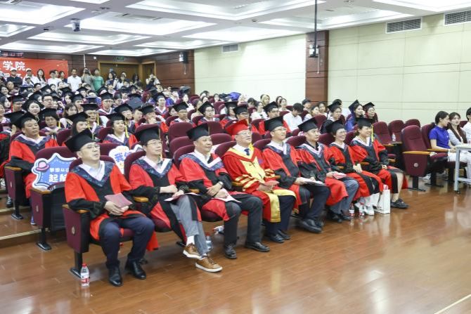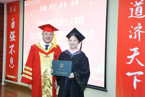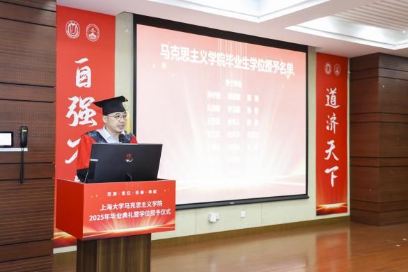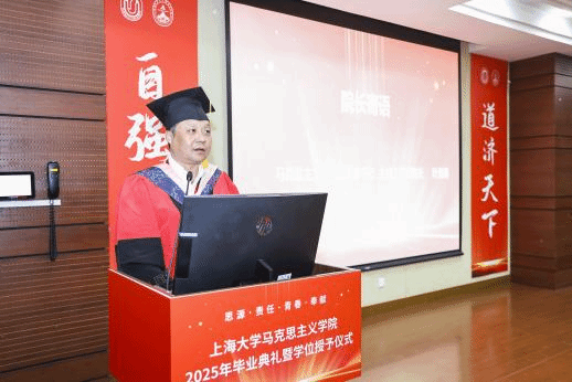 6月28日下午,“风华耀马院,青春启新程”ac米兰官网中文网站马克思主义学院2025年毕业典礼暨学位授予仪式在宝山校区东区蔡冠深讲堂隆重举行。ac米兰官网中文网站党委书记成旦红,马克思主义学院党委书记王国建,党委副书记、主持工作副院长叶海涛等学院领导班子成员,20余位导师代表,2025届毕业生及亲友代表、在校学生代表等齐聚一堂,共襄盛会。典礼由马克思主义学院2023级本科生刘万珅、陈慕阳主持。