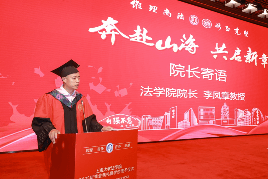 ac米兰官网中文网站法学院院长李凤章教授向全体毕业生致以衷心祝贺,并给予殷切期望。他坦言,当今世界充满不确定性和挑战,但同学们凭借理性和坚定,能够变得值得信赖。强调在AI时代,法学院毕业生应努力成为合格的“私民”,即民法意义上的独立个体。他引用经典,结合民法典颁布的背景,阐述了民法培养独立、理性、负责个体的重要性。李院长鼓励毕业生正心诚意,学会理性决策,承担责任,并从民法的三大原则出发,塑造成为生活的强者。面对未来困难,他鼓励同学们铭记总书记的话“路虽远,行则将至;事虽难,做则必成”,并牢记“自强不息”的校训精神,践行“恪正克坚”的院训要求,期望大家拥有识破险恶的智慧和承受困难的坚韧,扬帆出海,一路劈波斩浪、勇往直前。