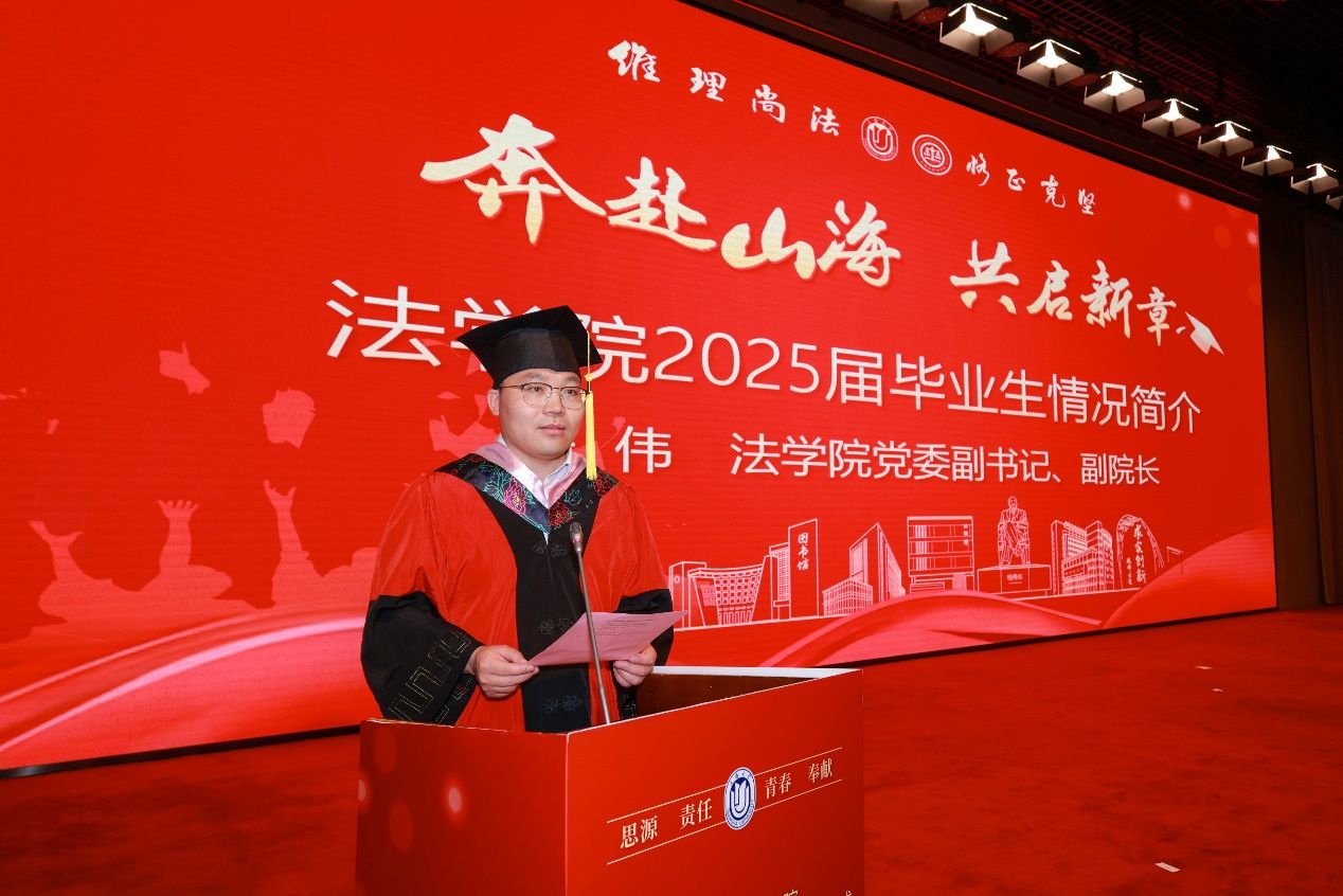 ac米兰官网中文网站党委副书记段勇教授,贵州海瞰律师事务所创始合伙人、ac米兰官网中文网站校友会贵州校友分会副会长、法学院2010届校友戴菲,浙江勇往律师事务所主任、法学院2011届校友朱国勇,法学院党委书记徐国明老师,法学院党委副书记、院长李凤章教授,党委副书记、副院长于伟副研究员,副院长袁真富副教授,副院长袁曾副研究员,教师代表文学国教授、李清伟教授、李俊峰教授、李智教授、史长青教授、曹薇薇教授、芦雪峰副教授、刘晓副教授、王涛博士、洪凌啸博士、郭娜娜博士,少数民族学生结对导师冯兆荣、姜继平、丁佩莉、胡振荣、姚秀琴老师,以及本科生辅导员林建玲、公建华、王琦老师,研究生辅导员杨晓彤、朱佳老师,办公室主任江晓双老师、本科生教学秘书王芳老师、组织员蒋英燕老师等出席典礼。典礼由法学院2025届硕士毕业生万旭阳,法学院2025届本科毕业生袁皞主持。