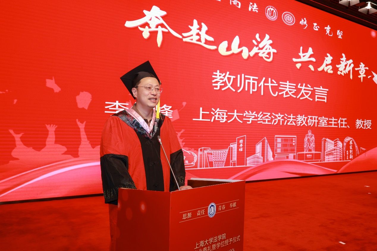 ac米兰官网中文网站法学院经济法教研室主任李俊峰教授作为教师代表向毕业生们送上三点寄语。其一,“不要怕”,既不要畏惧求职求学之路上的难题,艰难险阻咬牙亦能闯过,也不要害怕未来的不确定性,将其视作创造无限可能的机遇,坦然欣然面向未知。其二,“要向善”,同学们未来从事法律相关职业,一举一动关联重大利害,当以良善之心用能力、掌权力,哪怕是微小地让世界更美好,也能收获相应的回报。其三,“爱智慧”,法律人要拥有洞察事物本质的智慧,这不仅是爱知识、爱思考,更是对真理的热切渴望,在实践中把握权衡抉择,做到终身学习、独立思考,不盲目、不固执,以此从容应对世间万象。最后,老老师嘱咐学生们常回母校看看,并祝愿毕业生们事业有成、生活幸福。